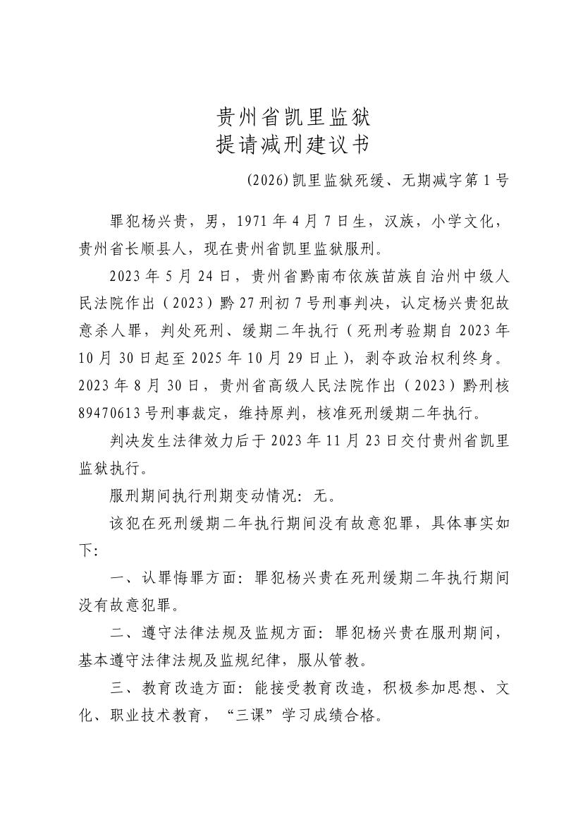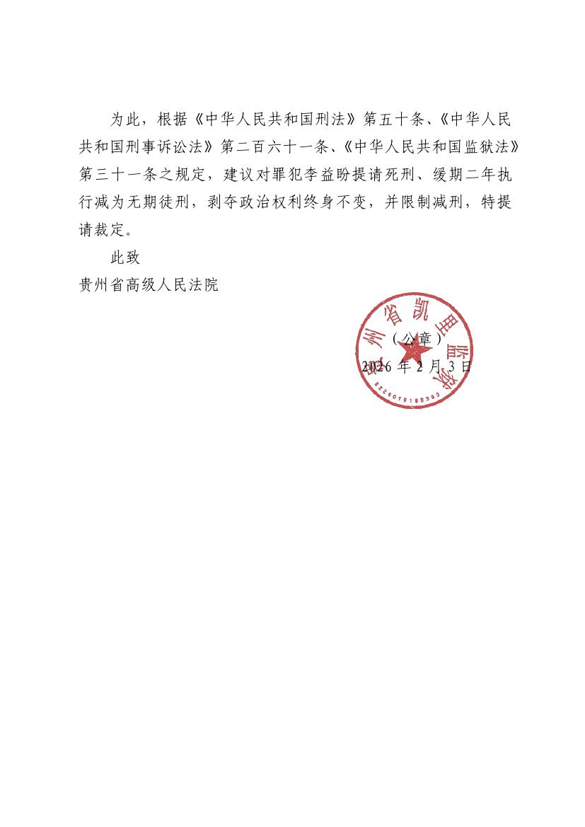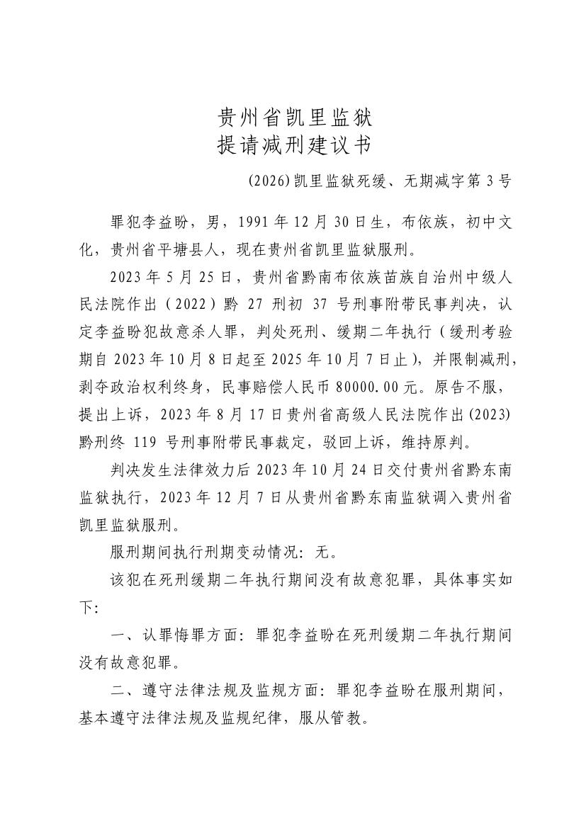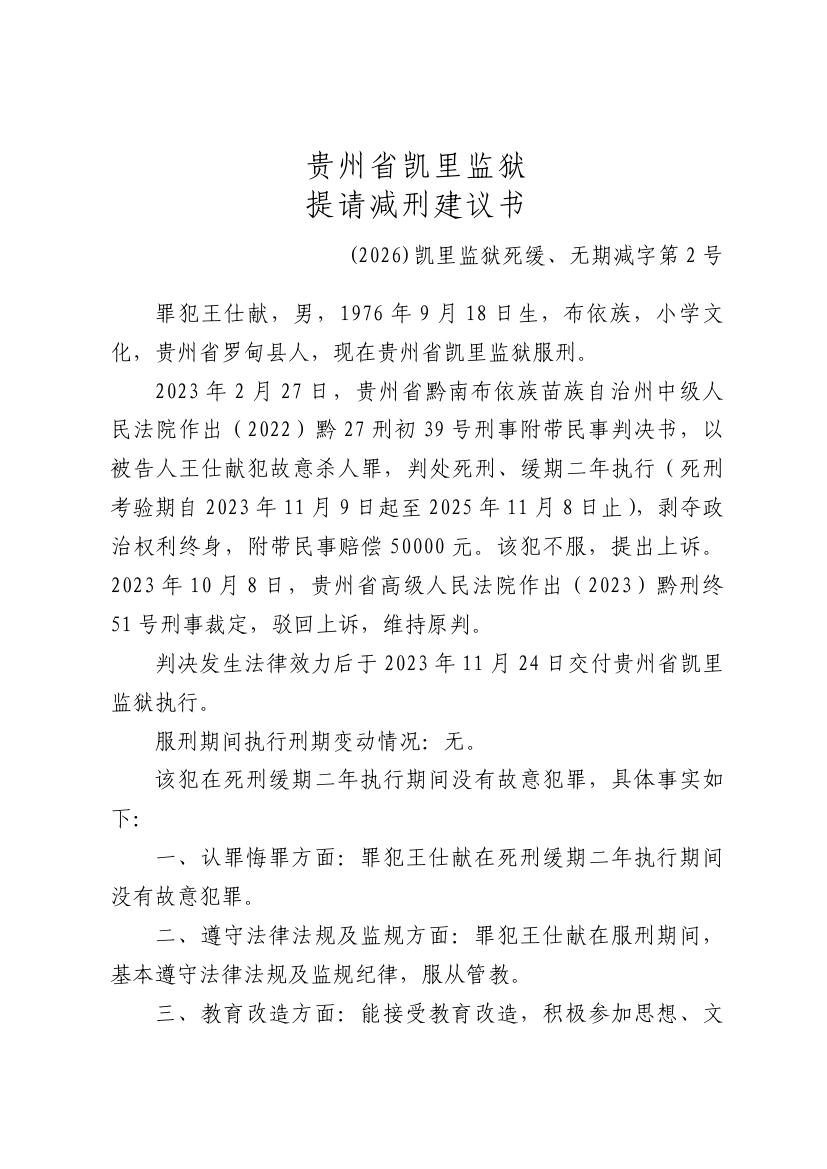 提请减刑建议书(2026)凯里监狱死缓、无期减字第1-4号