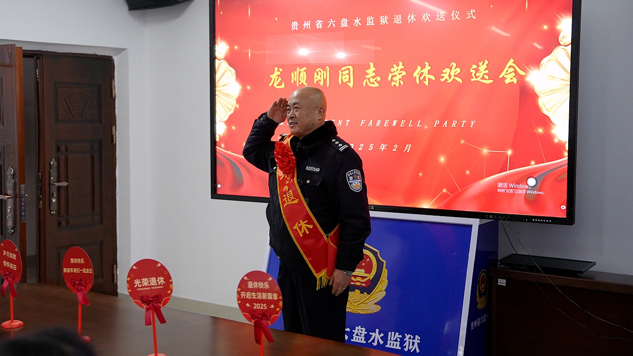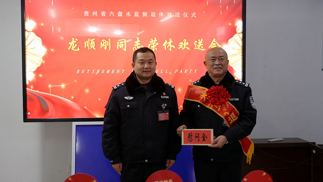 欢送会的尾声,监狱党委领导为龙顺刚同志颁发了象征着岁月沉淀与荣誉的退休纪念品。此次欢送会不仅是对龙顺刚同志多年奉献的肯定,更是贵州省六盘水监狱对每一位干警的关怀与尊重的体现,六盘水监狱将持续做好暖警惠警工作,营造温馨和谐的工作环境。