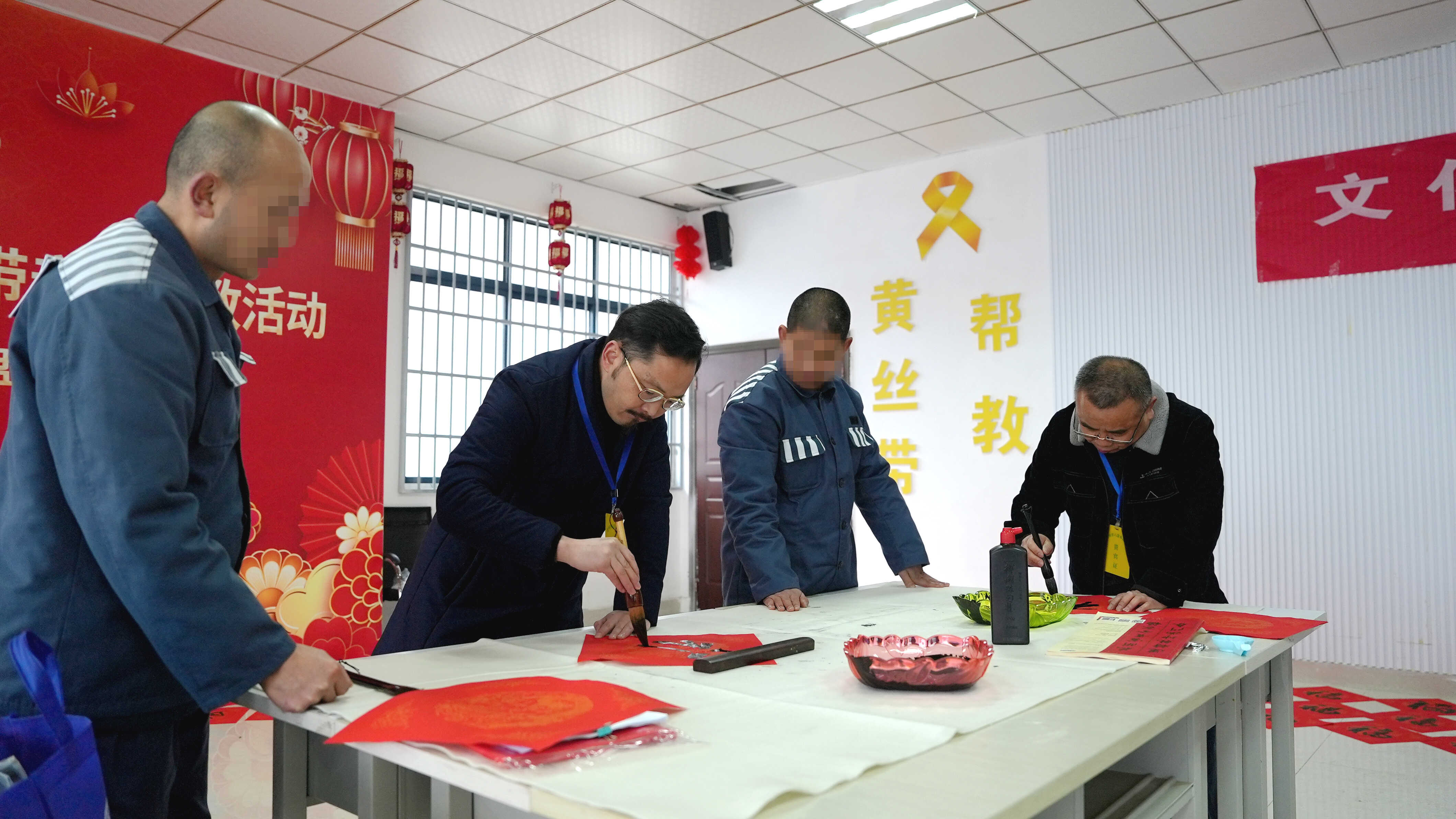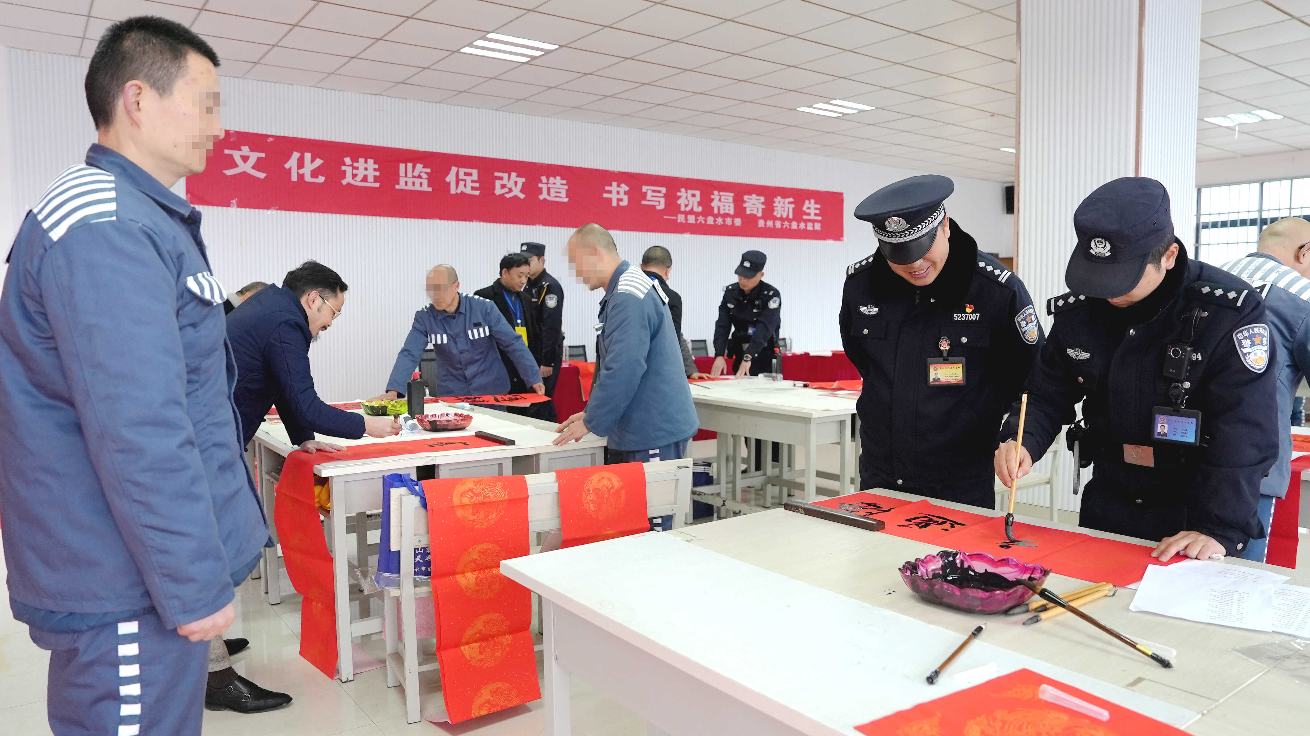 2月10日,在春节来临之际,为进一步丰富罪犯精神文化生活,深化文化改造内涵,引导罪犯在中华优秀传统文化中汲取向善向上的力量,六盘水监狱特邀民盟六盘水市委,到监狱开展“文化进监促改造,书写祝福寄新生”主题文化帮教活动,活动由民盟六盘水市委副主委卢彦带队,组织书法家协会盟员走进高墙,为监狱送来浓浓的新春暖意与文化滋养。