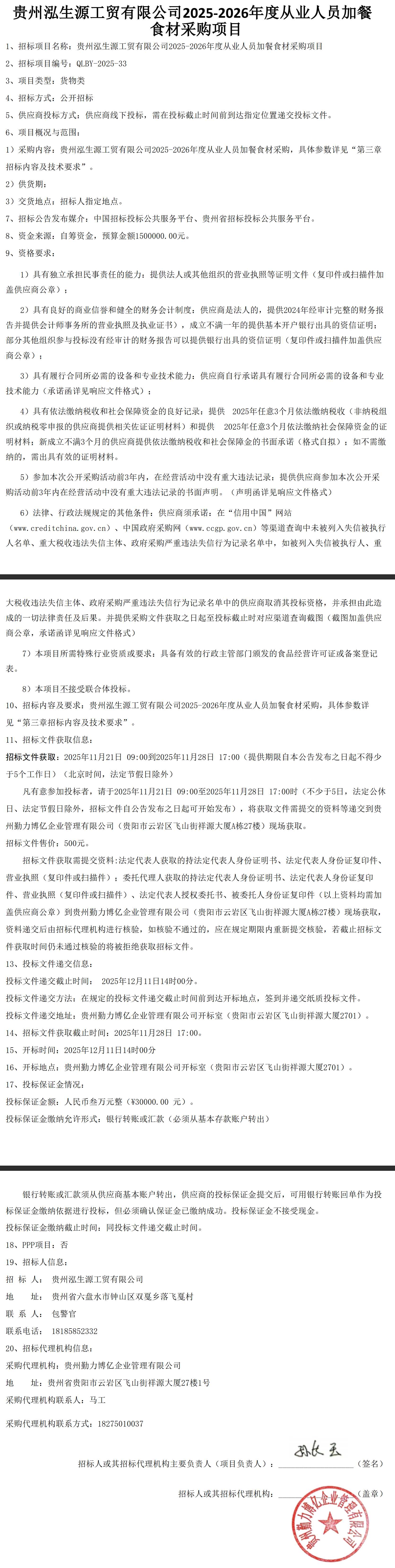 贵州泓生源工贸有限公司2025-2026年度从业人员加餐食材采购项目—采购公告