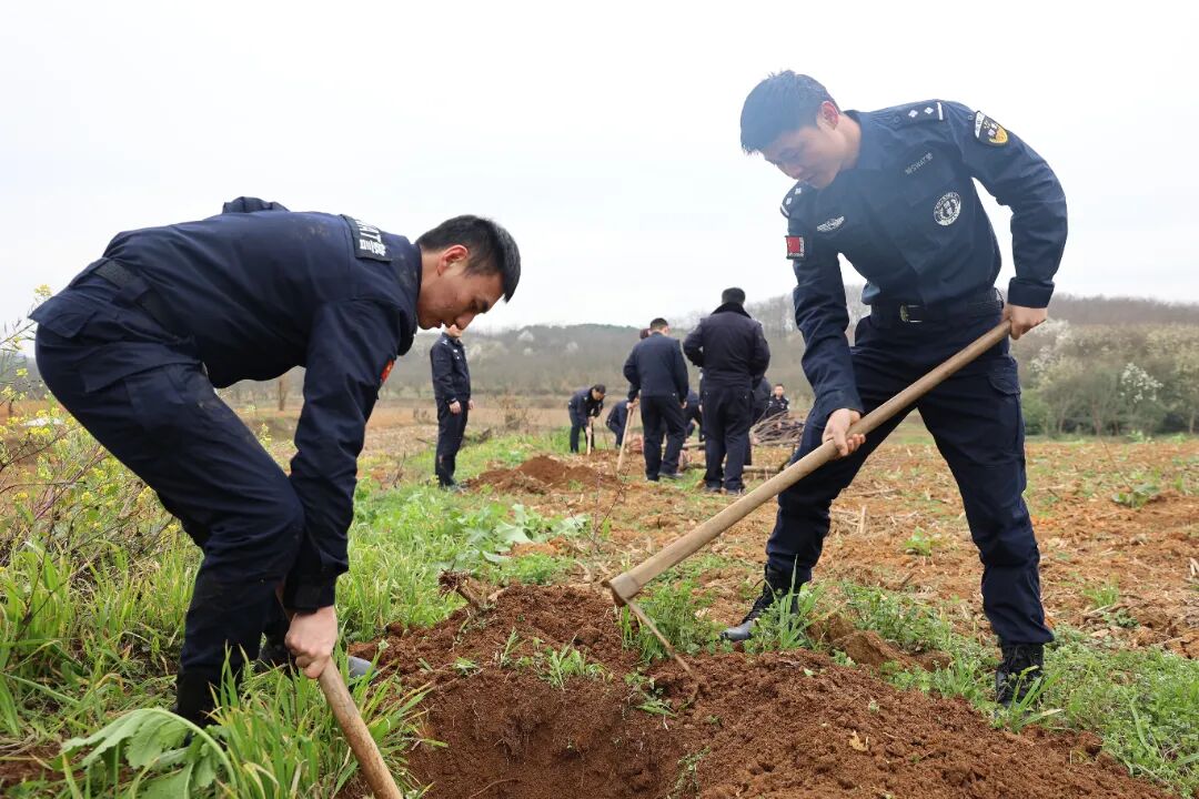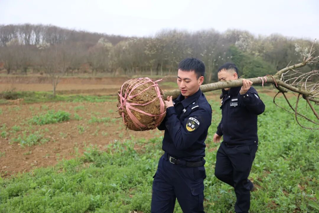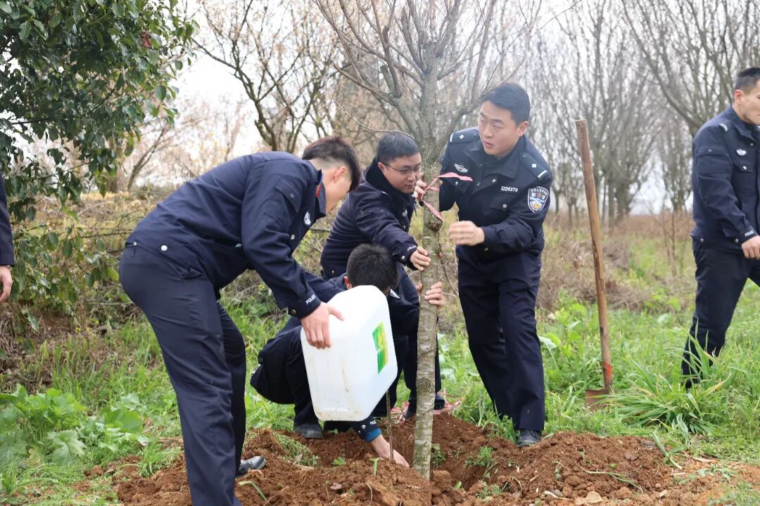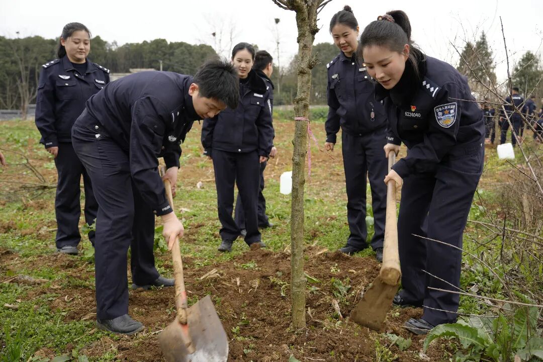 活动现场,青年民警们分工协作,挥锹铲土、扶苗填坑、浇水灌溉,每一个环节都认真细致,现场一片热火朝天的劳动景象。