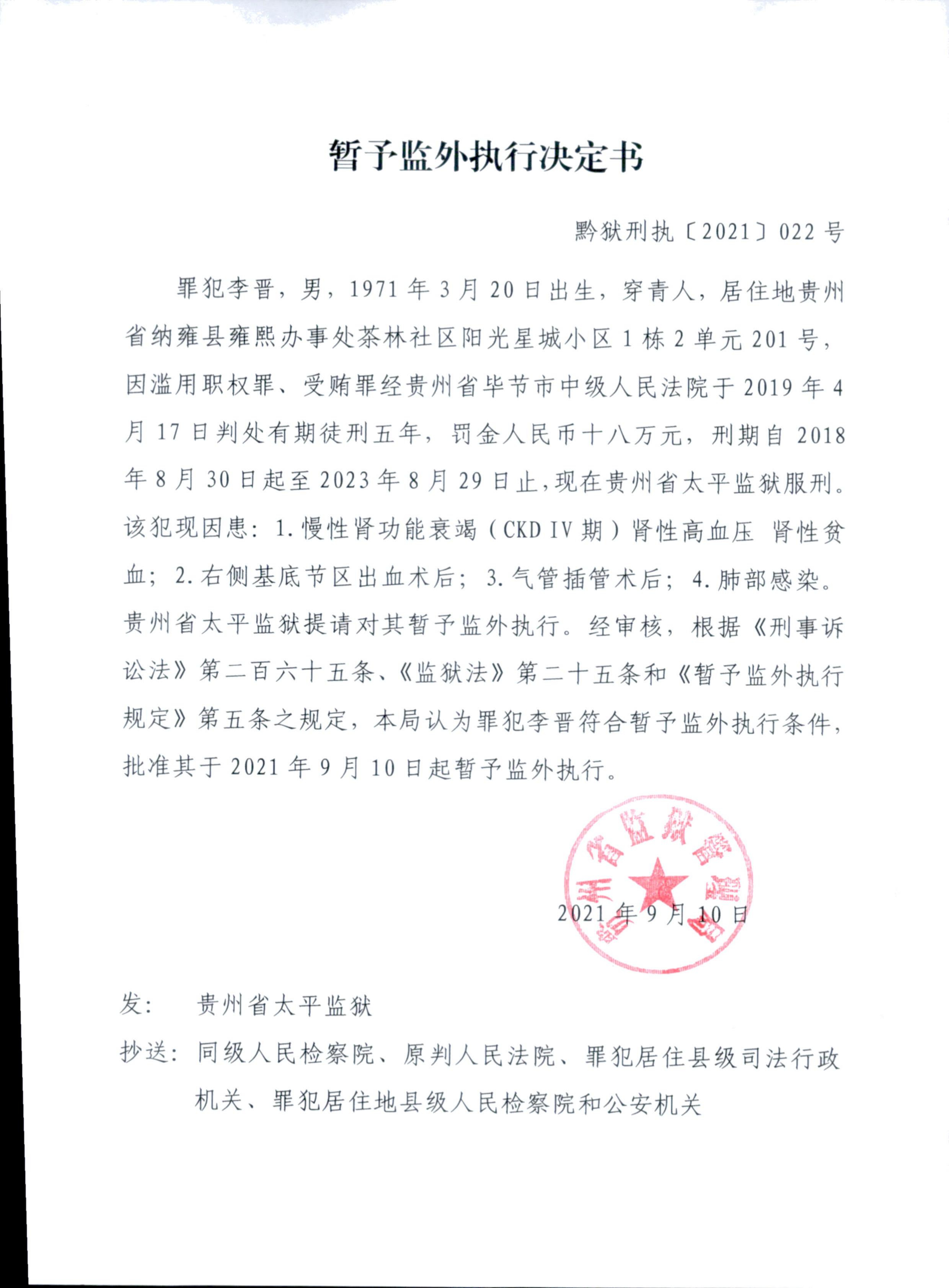 暂予监外执行决定书 黔狱刑执【2021】022号