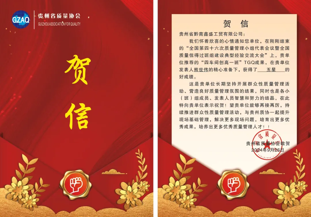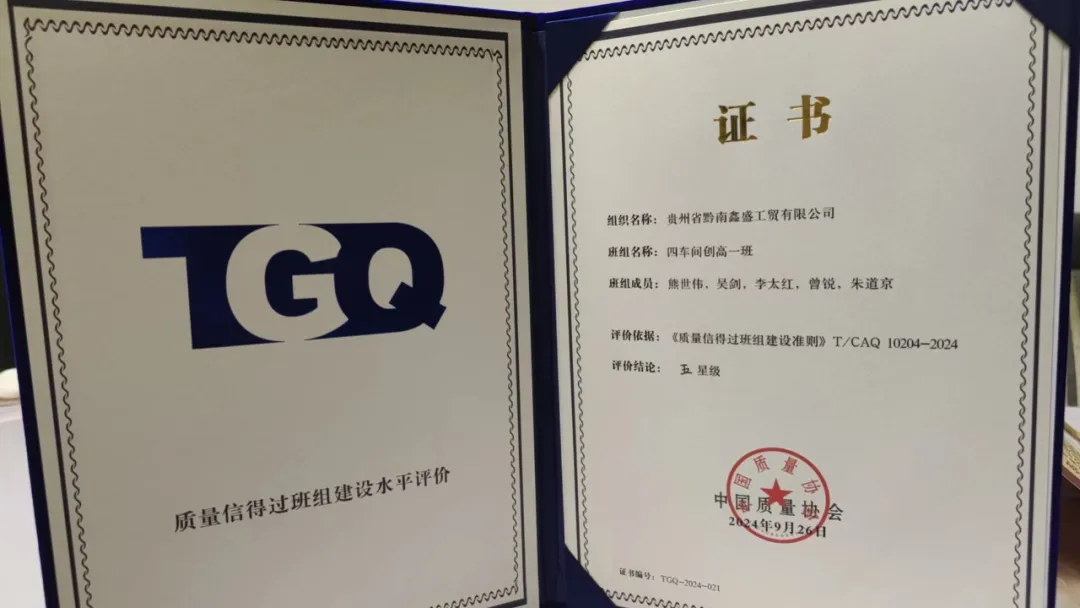 经过为期两天的激烈角逐,最终,贵州省黔南鑫盛工贸有限公司TGQ成果突出重围,获评全国质量信得过班组建设一等奖(五星级)。