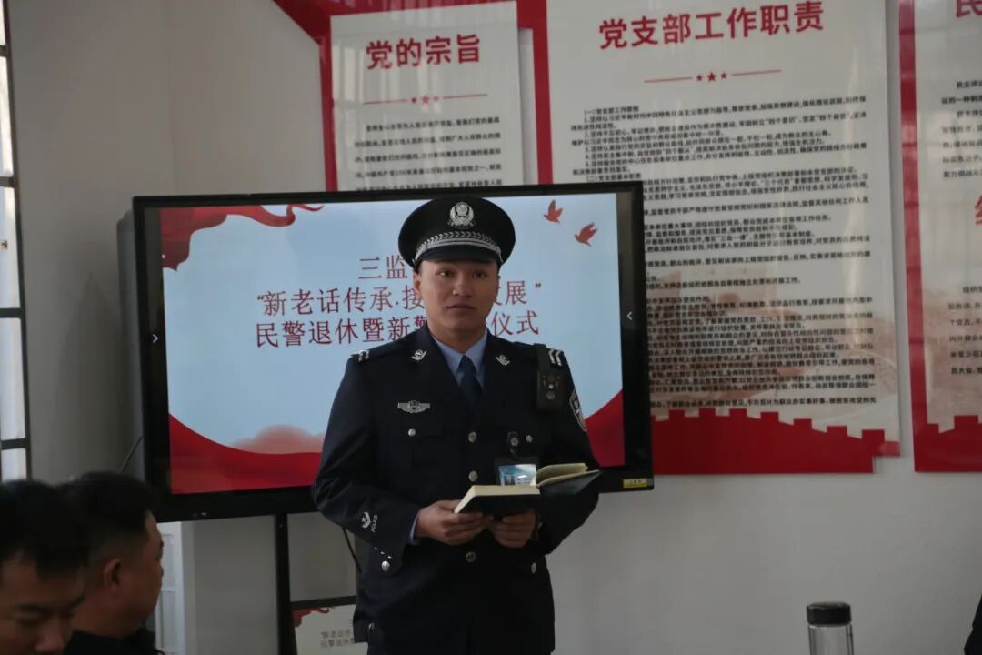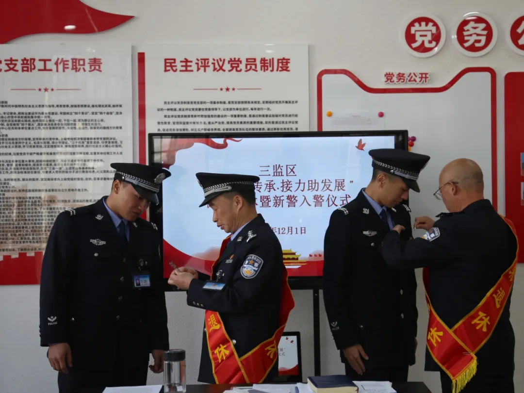 新警代表随后表态,将以老前辈为榜样,迅速完成角色转变,牢记初心使命,恪守法治精神,公正文明执法,全力守护监狱安全稳定,不负组织重托与前辈厚望,让事业薪火焕发新彩。在全体民警的见证下,老民警为新警佩戴警号,完成使命接力。