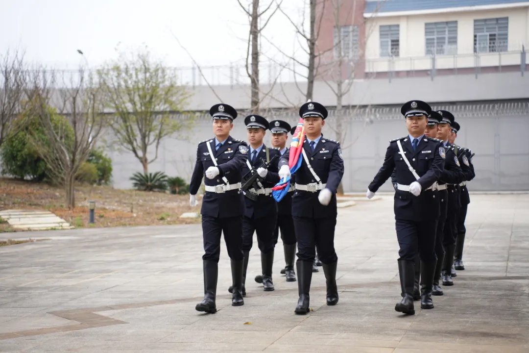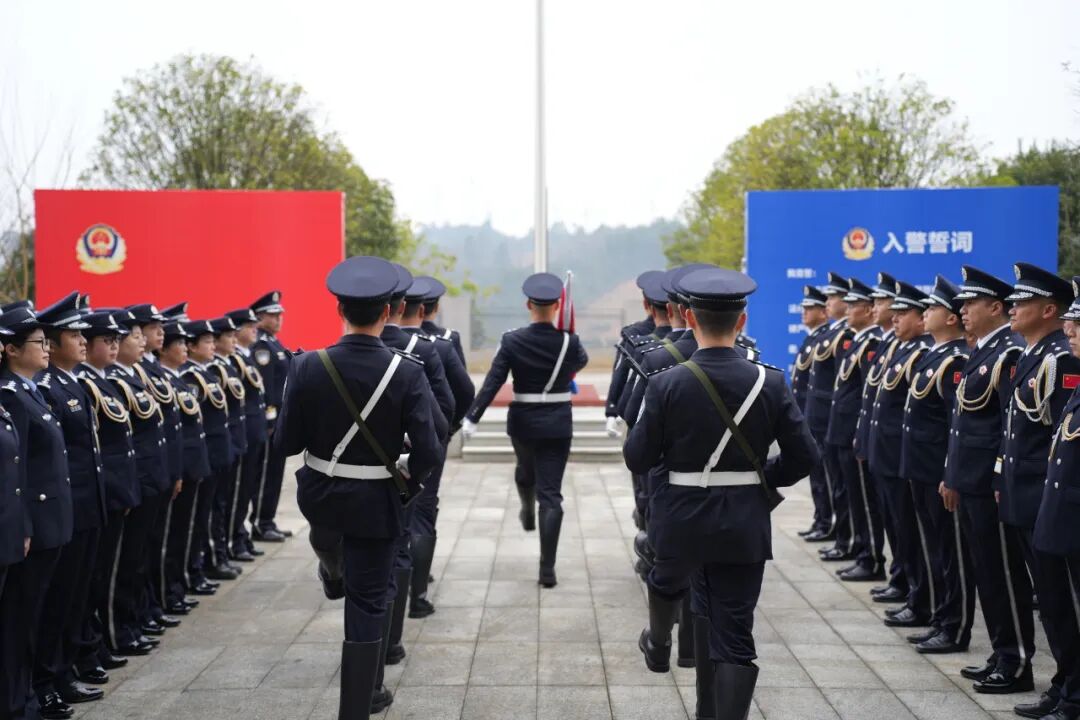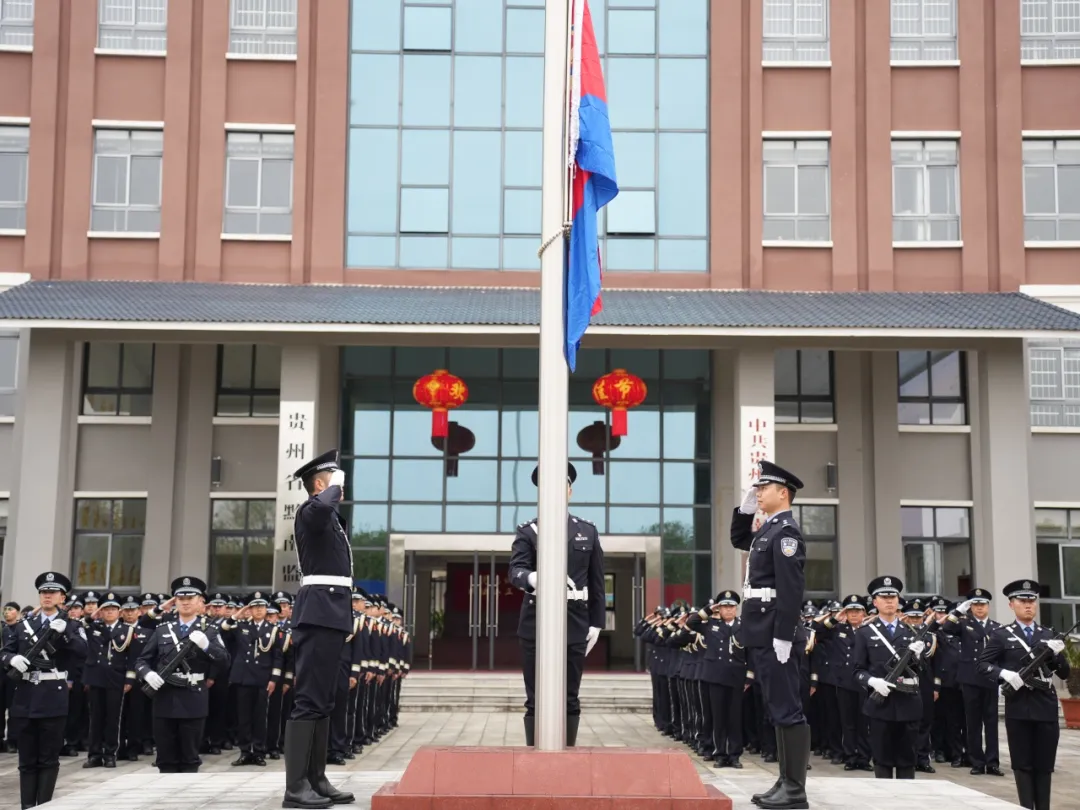 升警旗仪式在行政楼广场隆重举行。全体民警整齐列队,警旗护卫队迈着铿锵步伐护送警旗至旗杆下。随着激昂的《中国人民警察警歌》奏响,警旗冉冉升起,全体民警庄严敬礼,致敬藏蓝信仰。