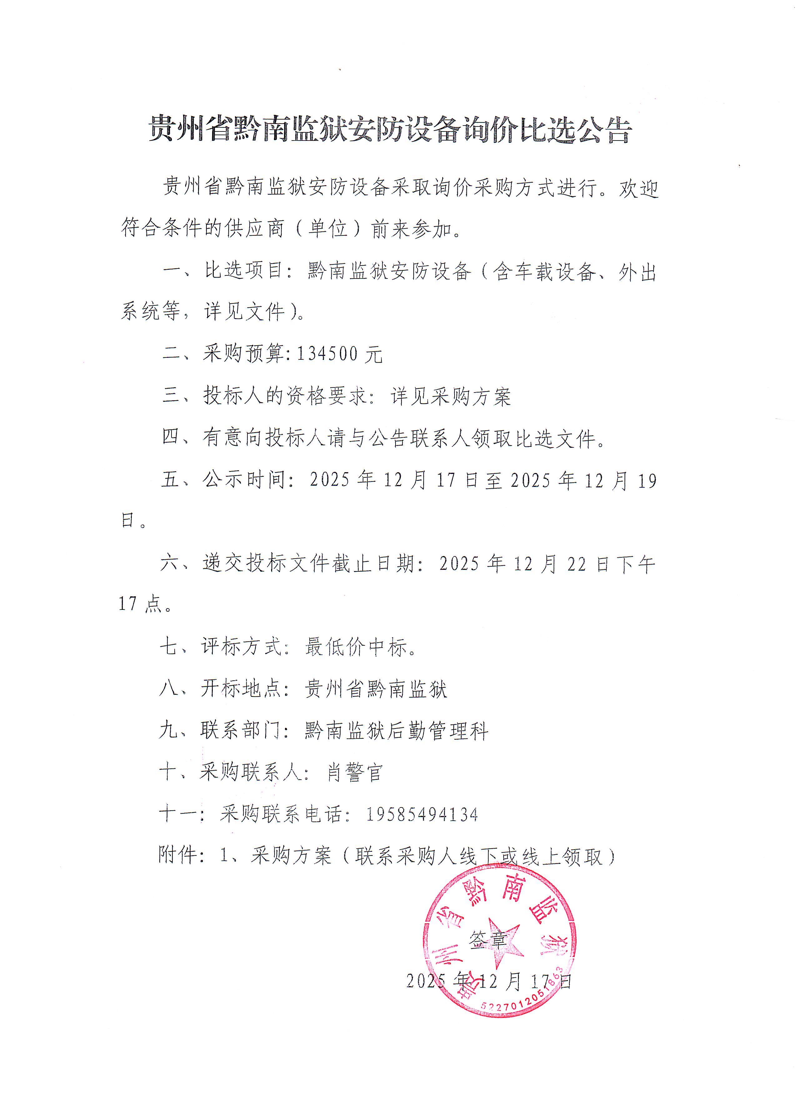 贵州省黔南监狱安防设备询价比选公告