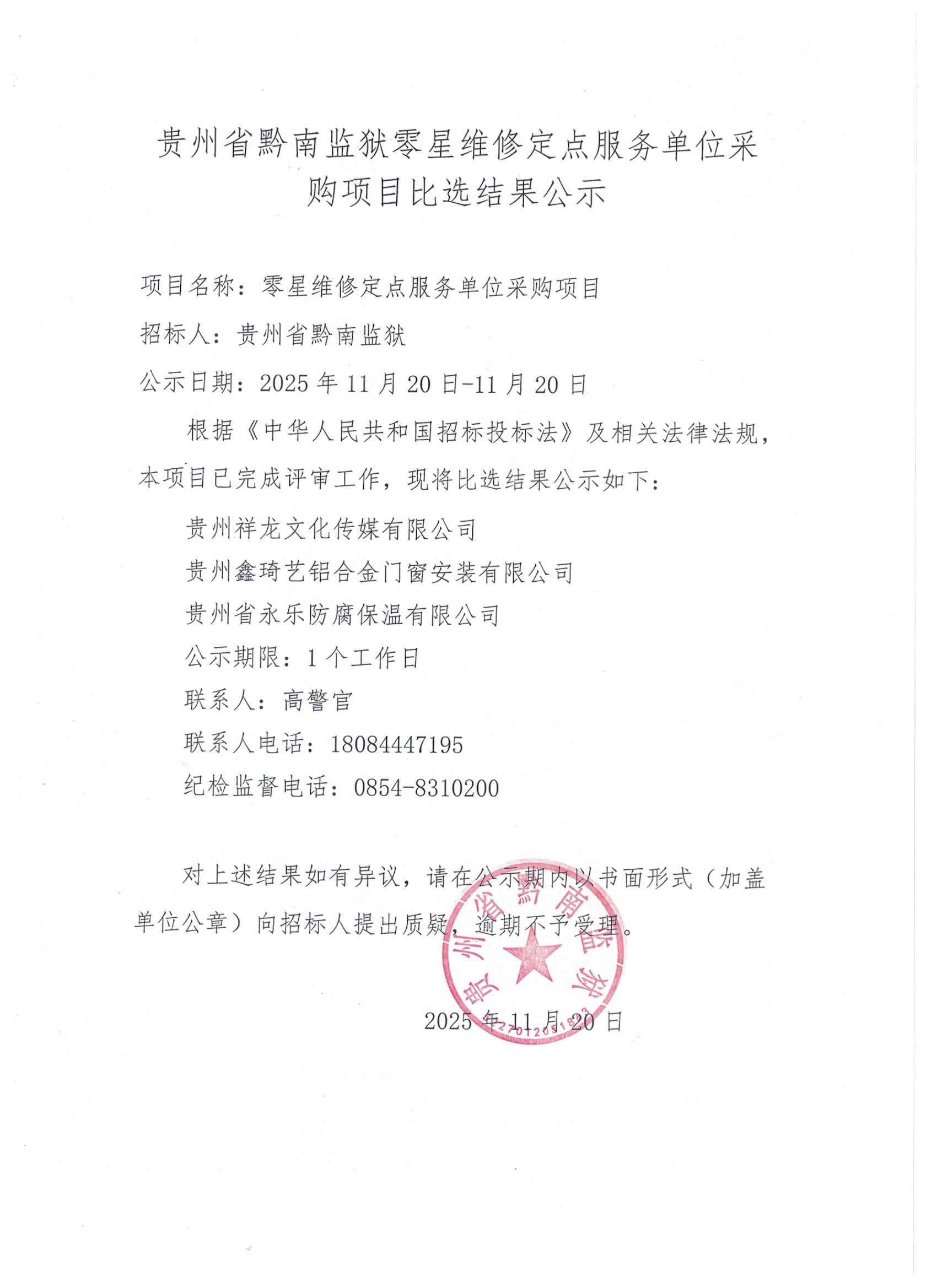 零星维修定点服务单位采购项目比选结果公示