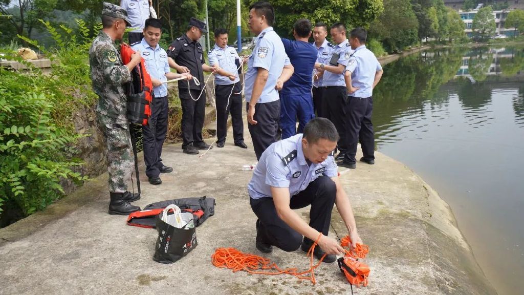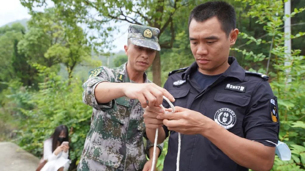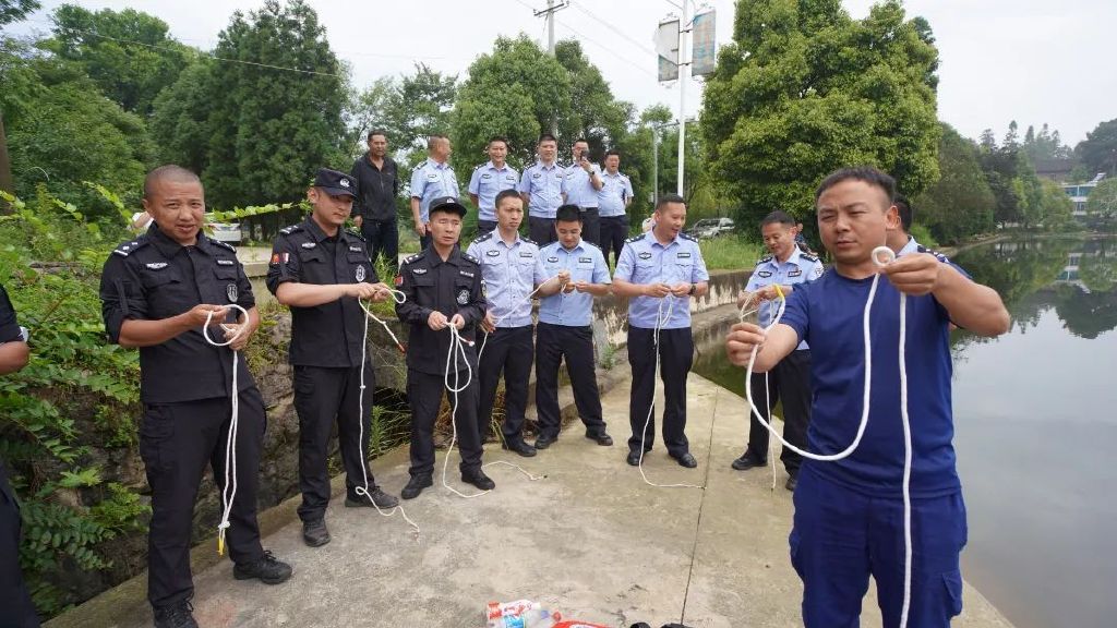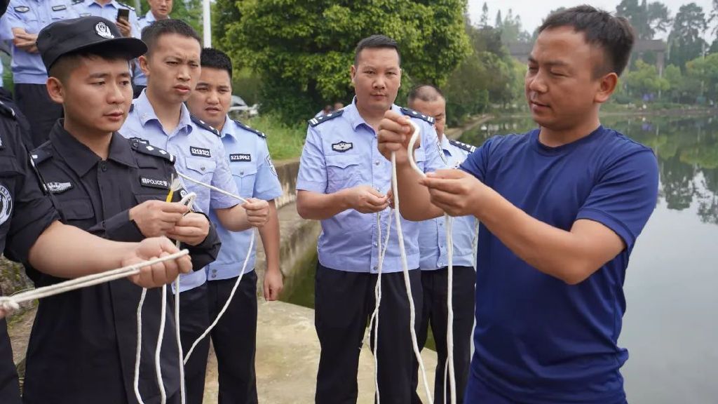 培训中,两位教官运用携带的抛绳、麻绳等常用逃生救援工具现场实践演练。教授民警单套腰结、三套腰结、卷结、锚结。