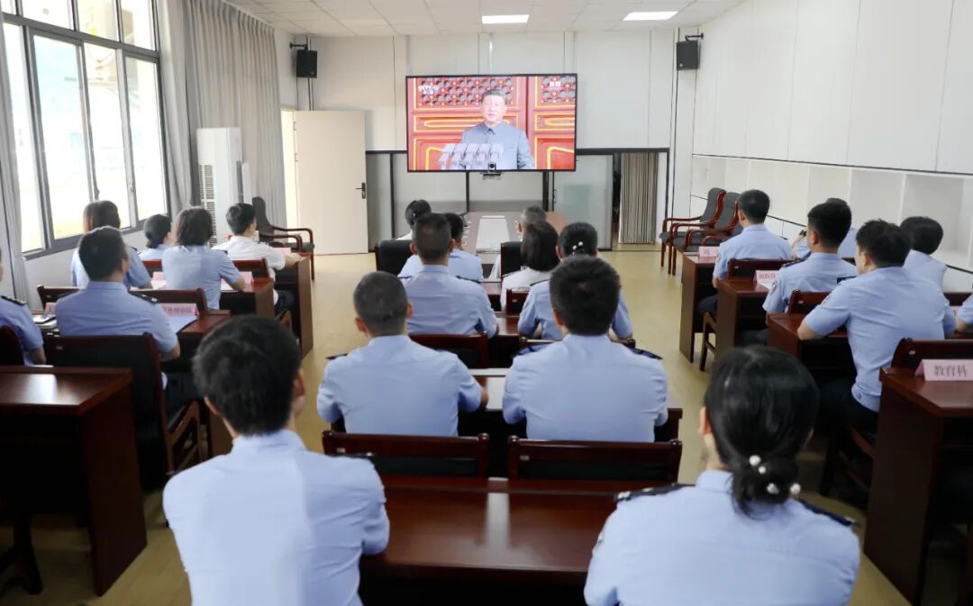 阅兵仪式拉开帷幕,徒步方队步伐整齐划一,气势排山倒海;装甲方队铁甲闪耀,威武雄壮;空中梯队战鹰列阵,翱翔苍穹。这一幕幕宏伟壮阔的景象,极大地振奋了民族精神,点燃了爱国热情,汇聚起奋斗伟力,更坚定了全院民警职工以中国式现代化全面推进强国建设、民族复兴伟业的信心与决心。
