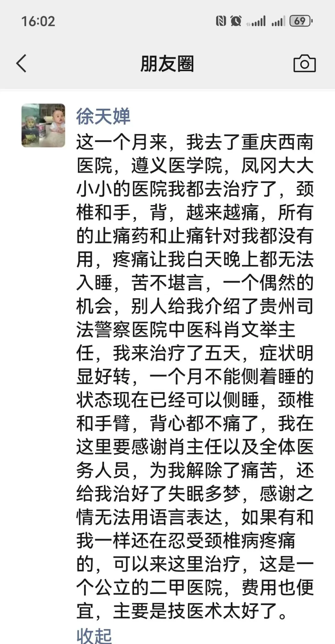 经过五天的治疗,徐女士的病情得到极大的缓解,并通过微信朋友圈表达了对中医科医务人员的感谢。