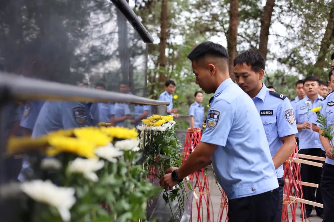 民警代表怀着沉痛悼念之情向革命先烈敬献花篮,并低头进行默哀,以表达对烈士的深情缅怀和崇高敬意。随后,青年民警依次绕行烈士纪念碑,通过瞻仰纪念碑上的浮雕和铭文,回顾着先烈们的丰功伟绩。