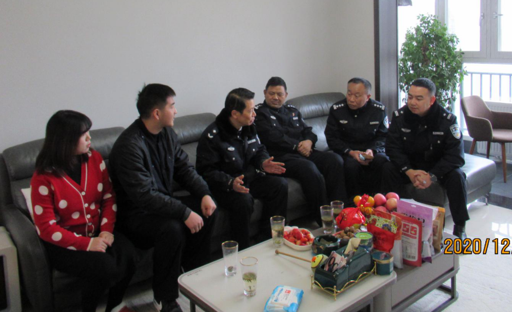 党委书记、监狱长潘亿与双警家庭冷朝兴、王欢欢悉心交流,详细询问他们的生活和工作情况,倾听他们对监狱工作的意见和建议,并向走访组同志细致安排有关事项