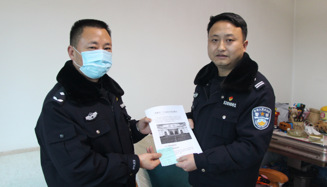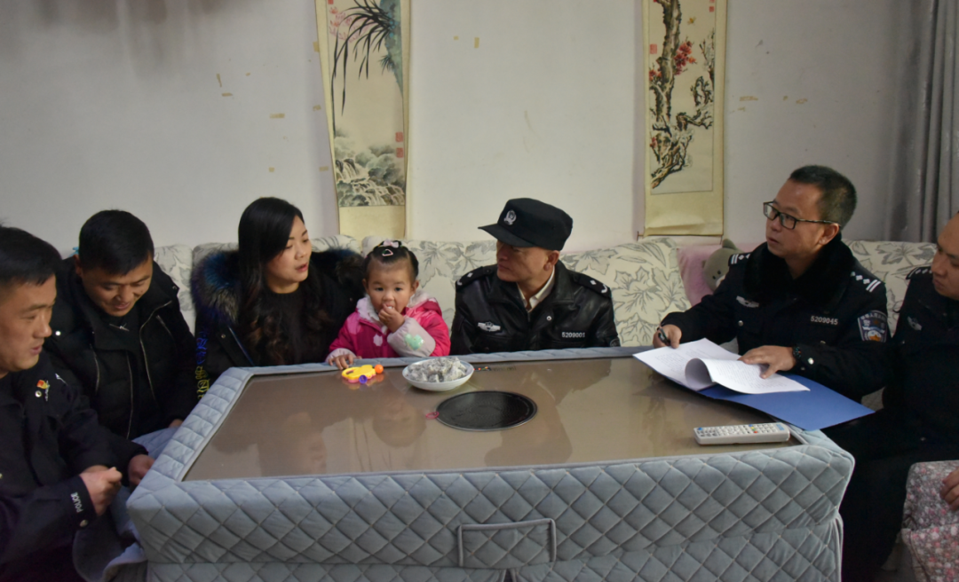 在民警项嗣燏家中,党委委员、政治处主任郭方富向其发放了党的十九届五中全会学习资料和走访联系卡