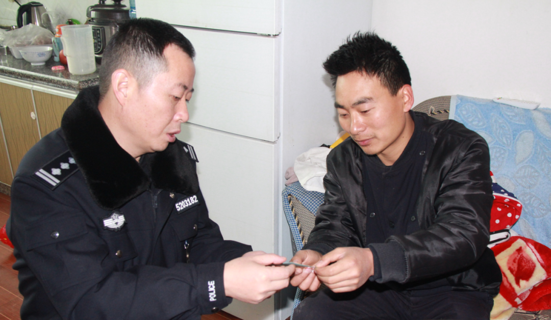 党委委员、副监狱长邱斌向民警罗忠勇发放走访联系卡