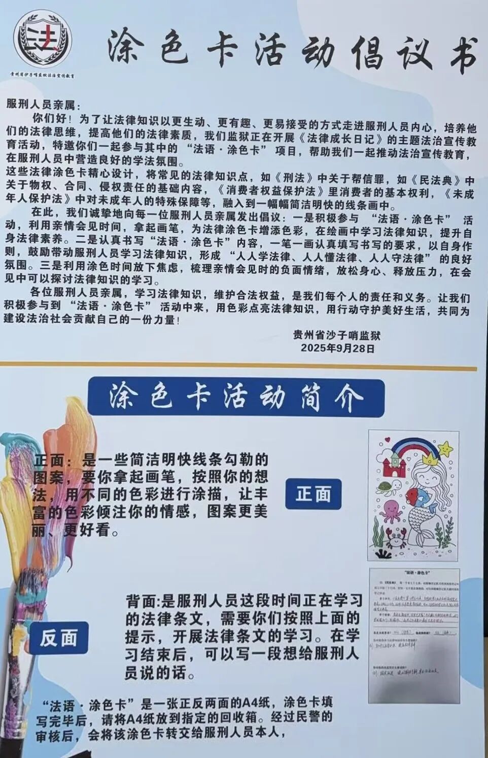 监狱打破“壁垒思维”,创新拓展法治教育辐射半径,构建“高墙内外”协同育人格局。创新推出“法语·涂色卡”特色项目,将法律寄语与绘画创作相结合,既作为学法成效的奖励载体,又让民警通过创作过程精准掌握罪犯心理动态;同步向罪犯亲属发放“法语·涂色卡”,允许双向互赠传递心声与期盼,实现法治教育“高墙内深耕、高墙外呼应”的双向互动与正向传播,以亲情纽带强化法治认同,筑牢罪犯回归社会的法治根基。