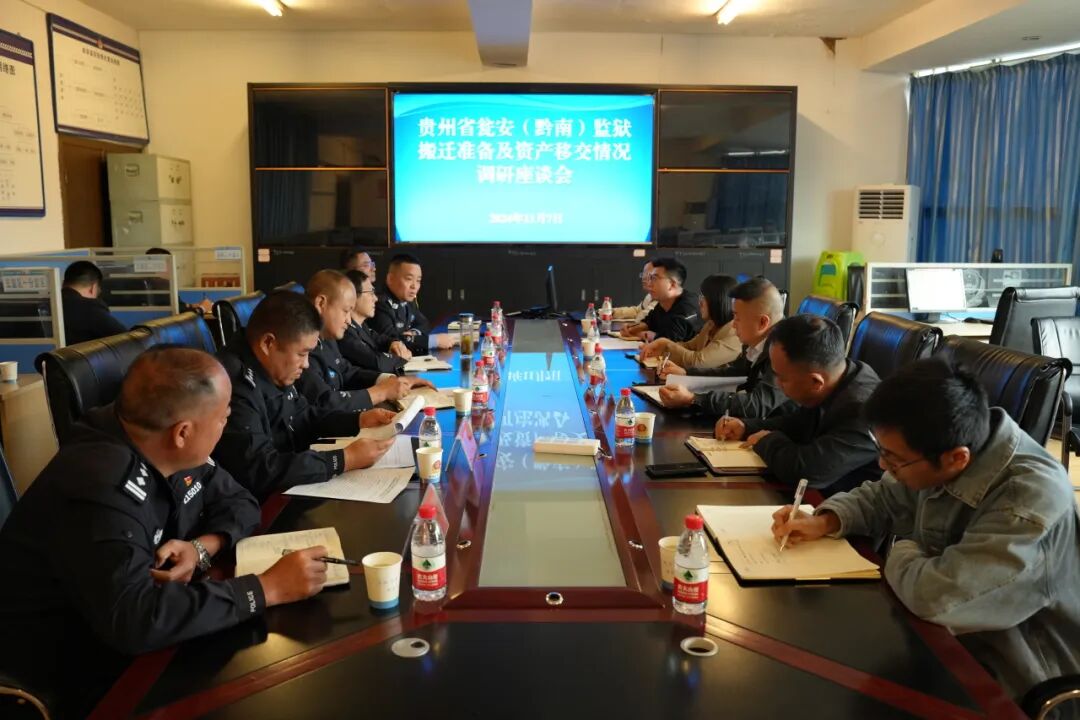 当天还召开了瓮安(黔南)监狱搬迁准备及资产移交情况调研座谈会,监狱领导及工作专班负责人,黔南州司法局和瓮安县司法局、住建局、自然资源局等负责同志参会。会上,监地双方就资产清理核查、评估、财务清算、历史遗留问题解决等工作达成一致意见,强调要共同谋划、密切协作,坚持依法依规、不留问题,实现资产依法移交、完整移交、平安移交、圆满移交。