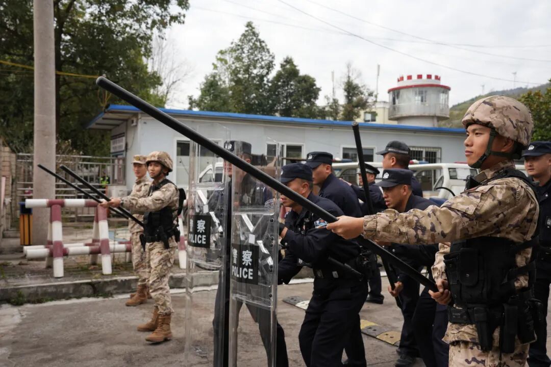 提升与驻监武警、驻地公安的联合处突能力,开展了“三警”联合应急处突演练,通过模拟真实场景,组织民警学习掌握了作战单元队形的移动和变化,练习了攻防基本技能,切实提高民警安全防护意识和快速反应处置能力。