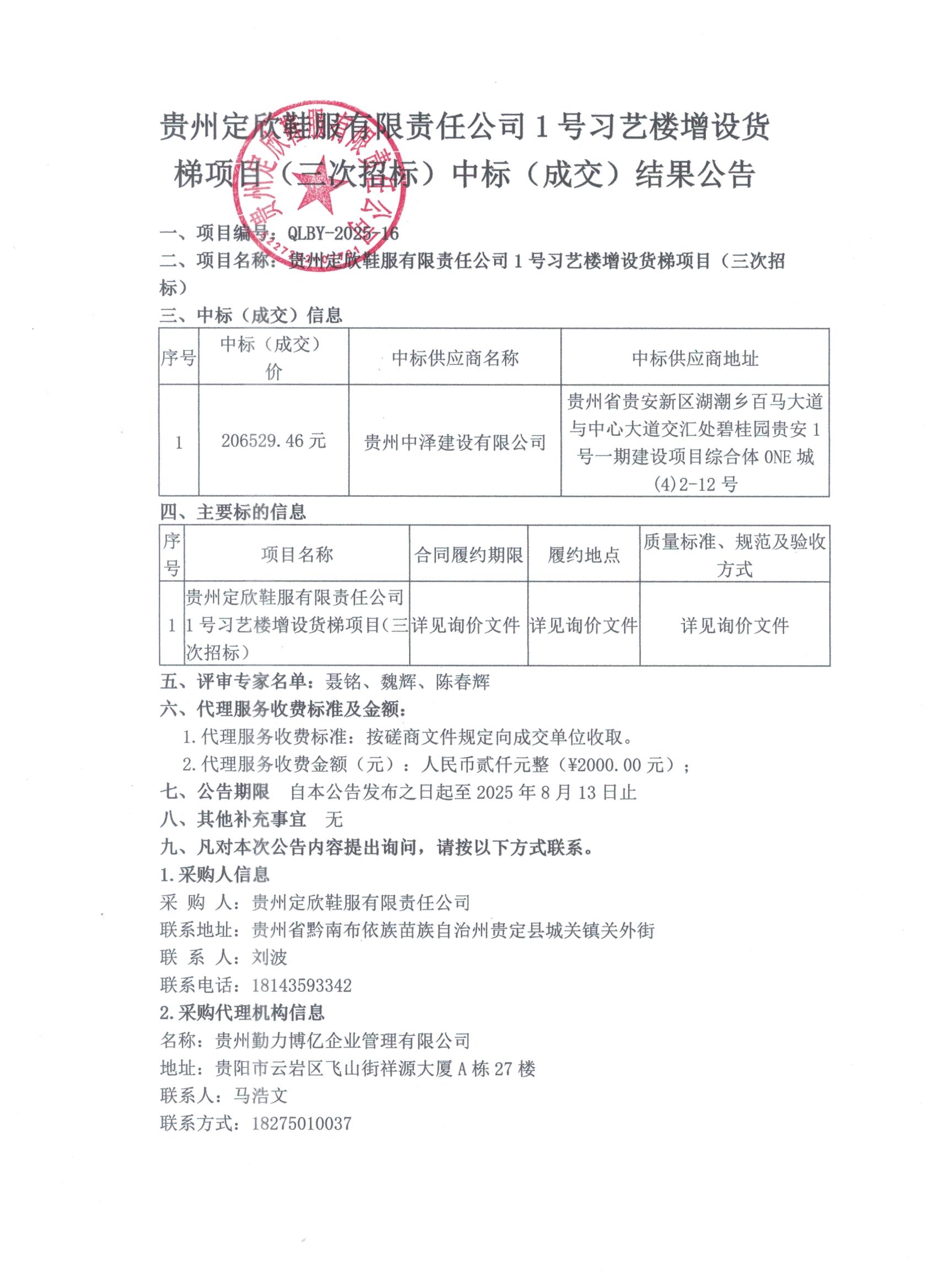 贵州定欣鞋服有限责任公司1号习艺楼增设货梯项目(三次招标)中标(成交)结果公告