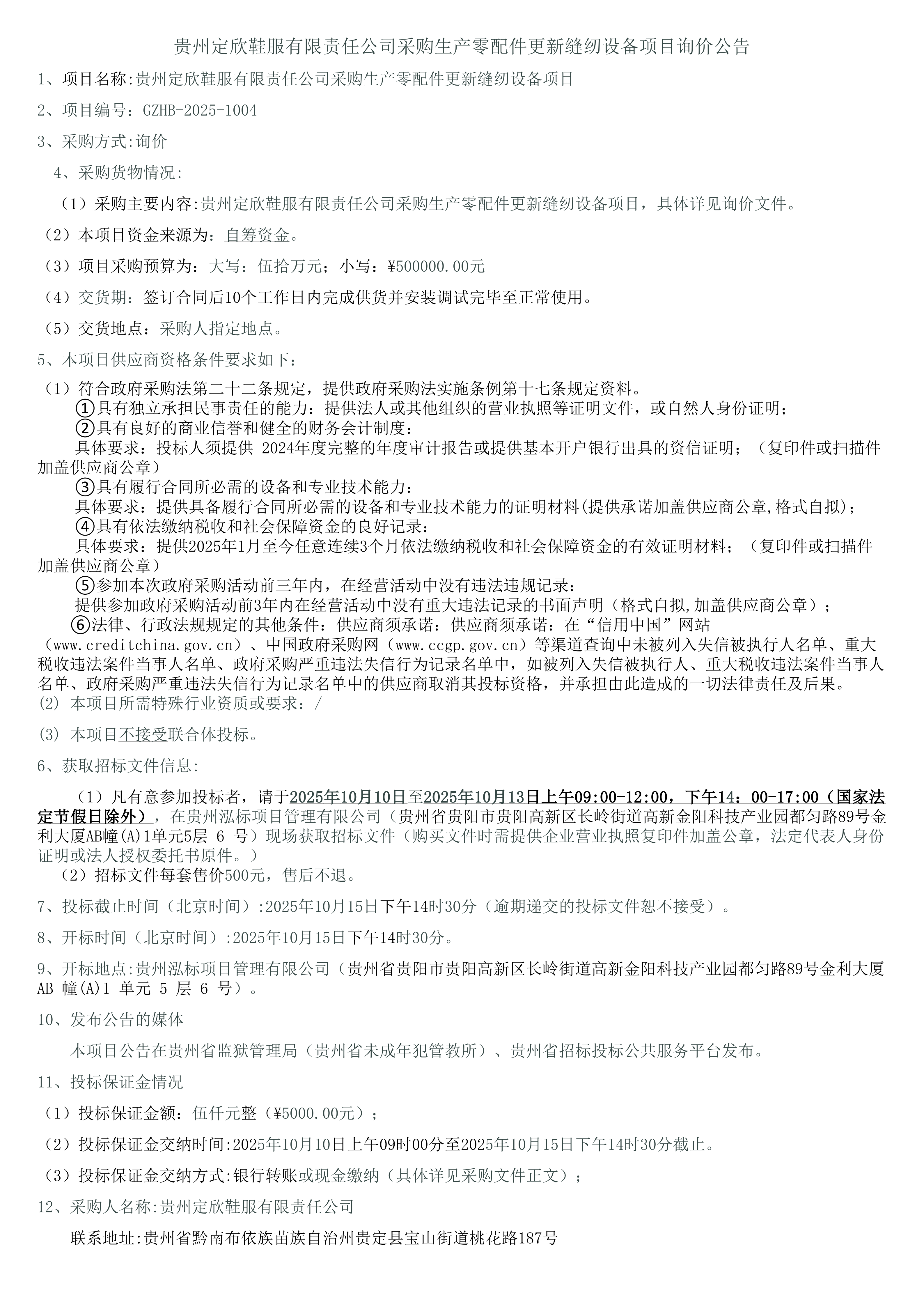 贵州定欣鞋服有限责任公司采购生产零配件更新缝纫设备项目询价公告