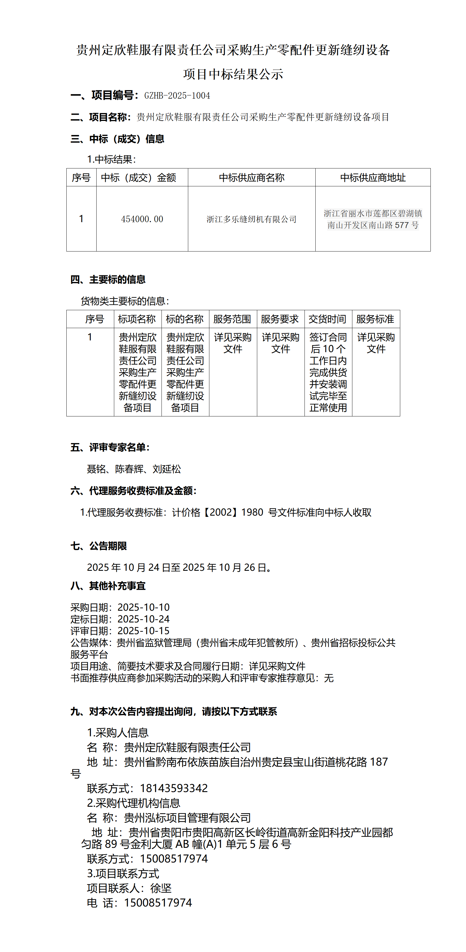 贵州定欣鞋服有限责任公司采购生产零配件更新缝纫设备项目中标结果公示