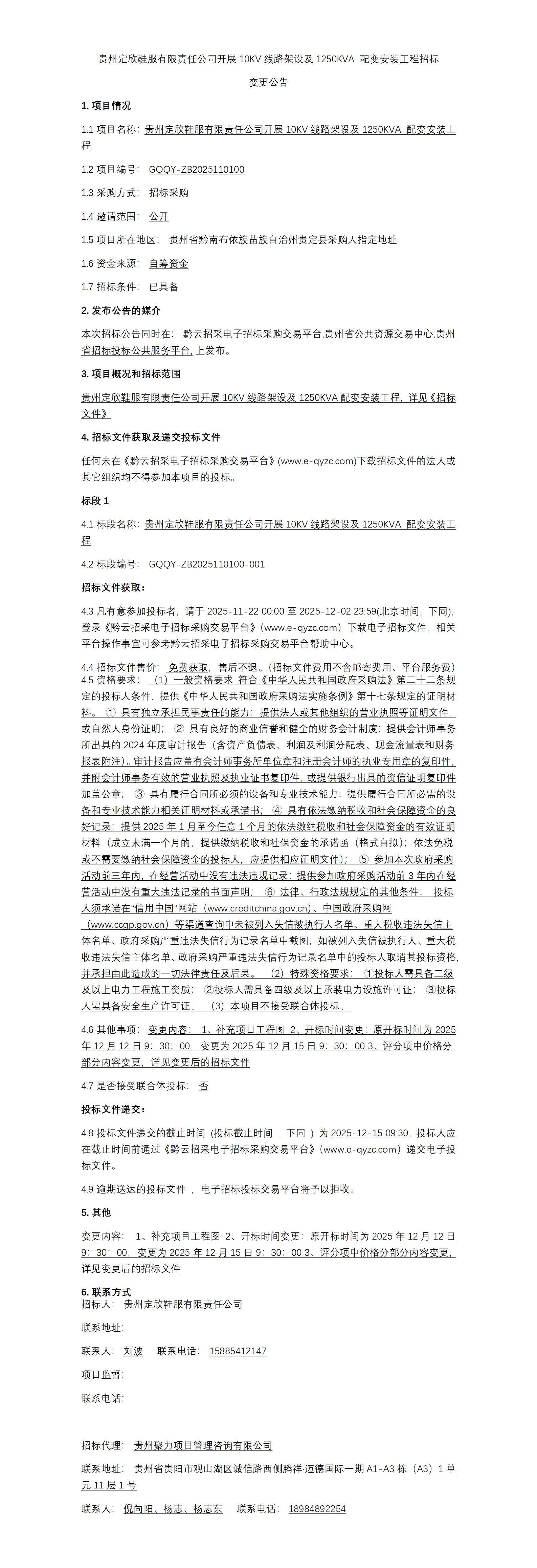 贵州定欣鞋服有限责任公司开展10KV线路架设及1250KVA 配变安装工程招标变更公告