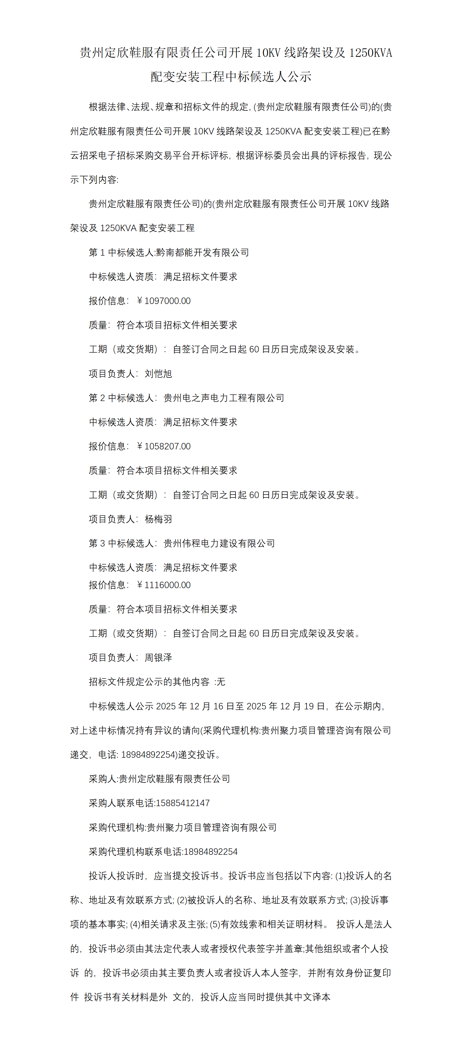 贵州定欣鞋服有限责任公司开展10KV线路架设及1250KVA配变安装工程中标候选人公示