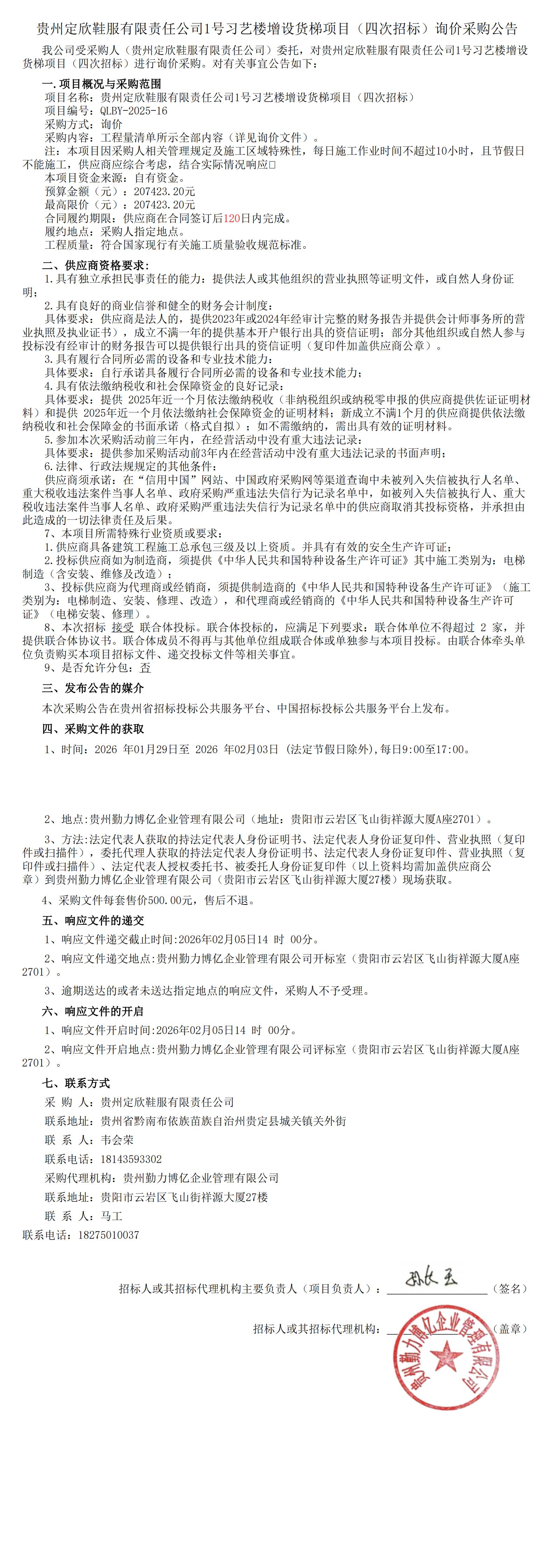 贵州定欣鞋服有限责任公司1号习艺楼增设货梯项目(四次招标)询价采购公告