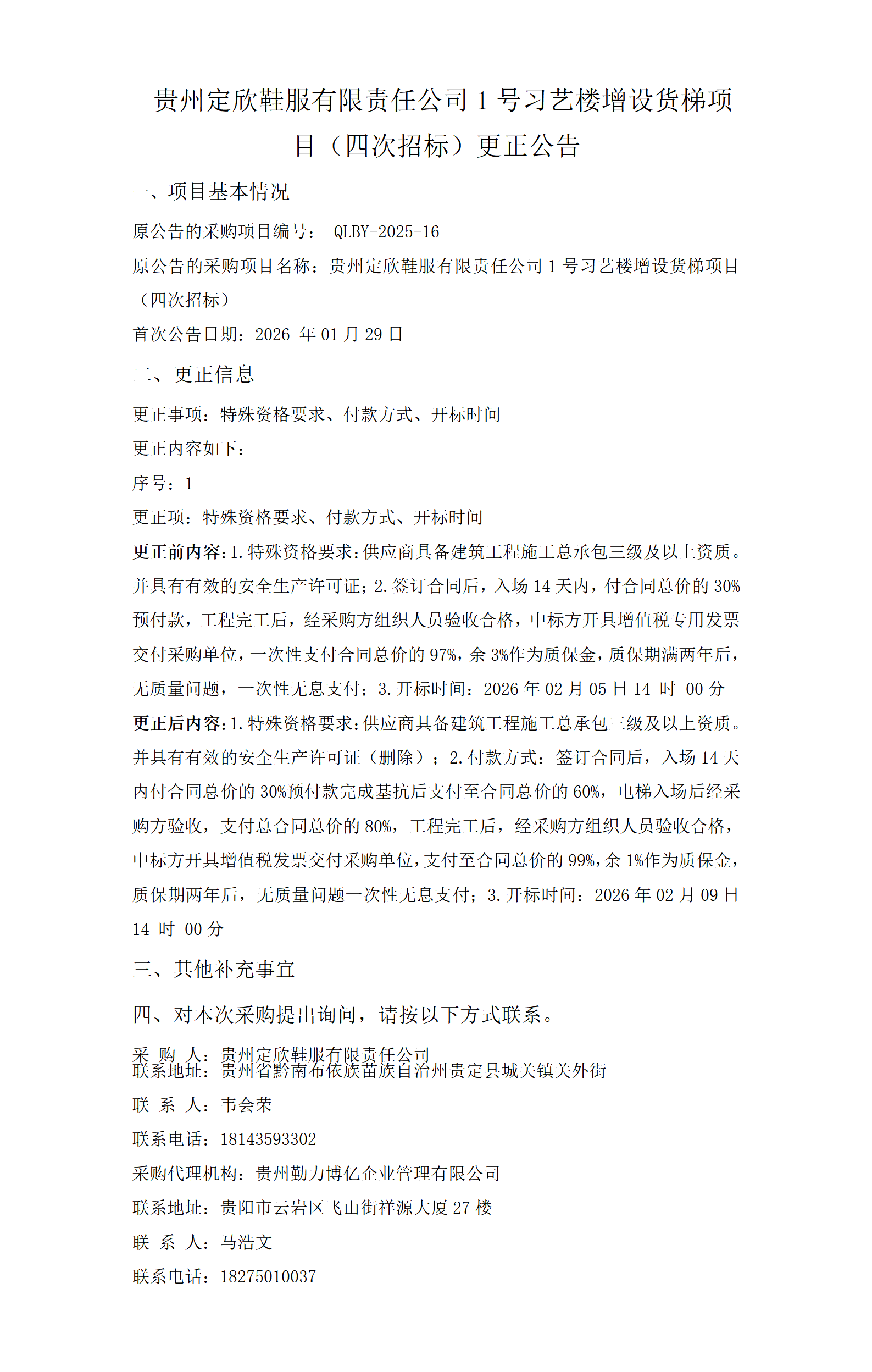 贵州定欣鞋服有限责任公司1号习艺楼增设货梯项目(四次招标)更正公告