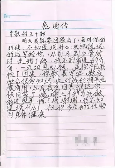 在王信武教过的“学生”当中,有这样一名罪犯,罗某某,由于文化知识少内心自卑,不与其他同改沟通交流,自我封闭,改造情绪低落。通过教育谈话,王信武了解到该犯只上过小学一年级的一个多月时间,连自己的名字都写得歪歪扭扭,他也想学习,改变自己现状,但无从下手。见此状,针对他的实际情况,王信武专门为他制定了学习方案,并时常鼓励他:“只要你肯学,我可以给予帮助”。从数学的加减乘除法、语文的拼音写字到罗某某独立完成课本作业,就这样,罗某某在习得文化知识的同时,曾经错误的思想也发生了转变,开始积极改造,一年后成为改造中的标兵,在他刑满出狱时特意写了一封感谢信,向王信武表达心中的感激。