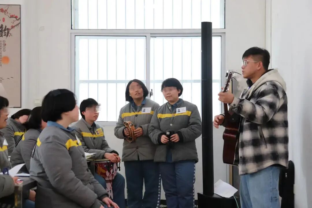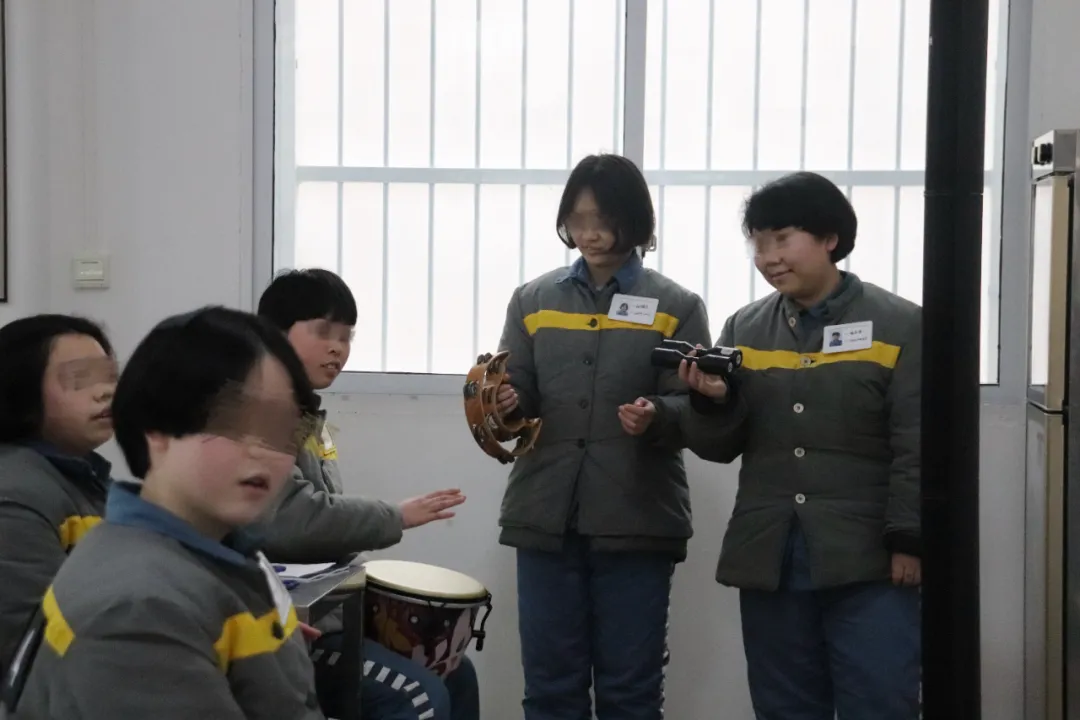 “身体准备!音乐准备!快乐准备!”随着老师充满活力的引导,生疏的节奏逐渐变得整齐,羞涩的面容舒展开来。她们跟着吉他伴奏,有节奏地晃动摇铃、拍打鼓面,全身心沉浸于旋律之中。音乐成为一种无需言语的沟通,帮助她们释放压力、宣泄情感,在韵律中寻得内心的平静与和谐。