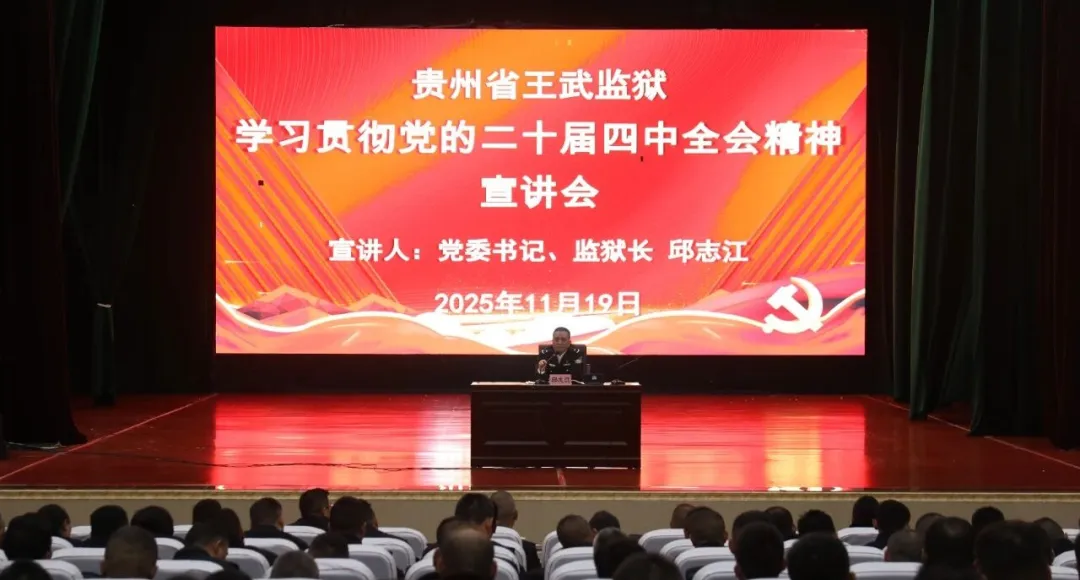 为深入学习贯彻党的二十届四中全会精神,提高民警职工政治能力、领导能力、工作能力,11月19日,贵州省王武监狱召开学习贯彻党的二十届四中全会精神宣讲会。监狱党委书记、监狱长邱志江作宣讲报告。监狱党委班子成员、全监除值班执勤外全体民警参加会议。
