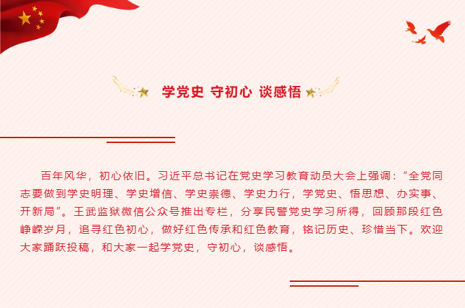 监狱统一订制了党史学习教育记录本,要求全监党员民警认真抄写学习笔记,撰写学习心得,力求以学习提升能力素养、增强工作本领,以交流启发工作思路、汇聚强大能量。监狱还充分发挥“两微一网”的宣传媒介作用,在微信公众号上推出党史学习教育专栏,让大家在专栏上学党史、守初心、谈感悟,分享自己在党史学习教育中的心得体会,追寻红色初心,做好红色传承和红色教育,铭记历史、珍惜当下,从党史学习教育中感悟初心使命和汲取奋进力量。