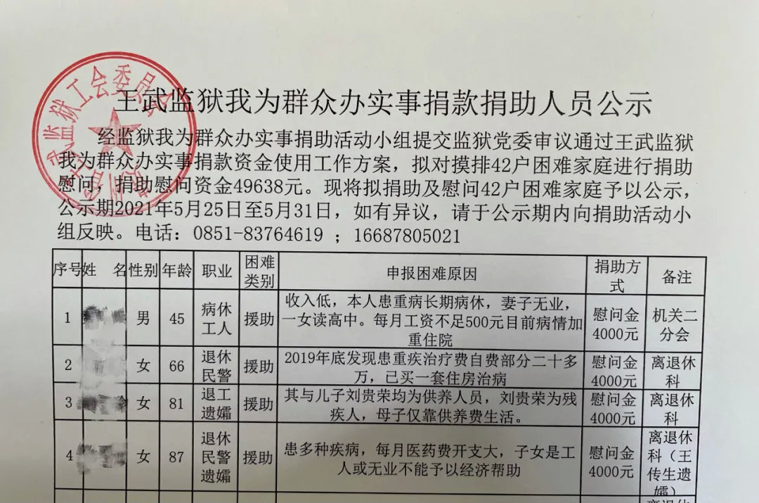 监狱将党史学习教育成果转化为为民服务的实际行动,紧密联系工作实际,将党史学习教育与队伍教育整顿、监狱综合治理等有关工作有机结合,将解决群众的“急难愁盼”问题落实到“我为群众办实事”活动之中,认真制定具体工作方案,列出时间表、任务图,明确责任领导、牵头部门抓工作落实,以实际行动检验党史学习教育成效。党史学习教育开展以来,共开展“我为群众办实事”活动15次。紧紧围绕执法为民工作理念,对监狱大门外闲置活动板房进行装修改造,布置成会见候见厅,作为监狱文明执法、法治宣传、安全防范和温馨服务等多功能服务窗口,每天平均接待40余人次的咨询或业务办理,得到了服务对象的一致认可。结合工作实际,将“我为群众办实事”活动与巩固脱贫攻坚成果、乡村振兴有效结合,组织青年民警赴对口帮扶点长顺县代化镇开展普法宣传等活动。为进一步畅通农产品购销渠道,助力群众增收,持续巩固扶贫工作成果,监狱结合工作需要,按计划从党建扶贫点长顺县鼓扬镇纪堵村采购蔬菜等农产品3万4千余公斤,价值3万7千余元;代购代销苗姑娘系列辣椒制品共4千余瓶,价值8万余元。为2020年单位工会会员办理完成片区医疗互助慰问金30600余元,共计14人次。开展“我为群众办实事”爱心捐助活动,目前收到爱心捐款47000余元。