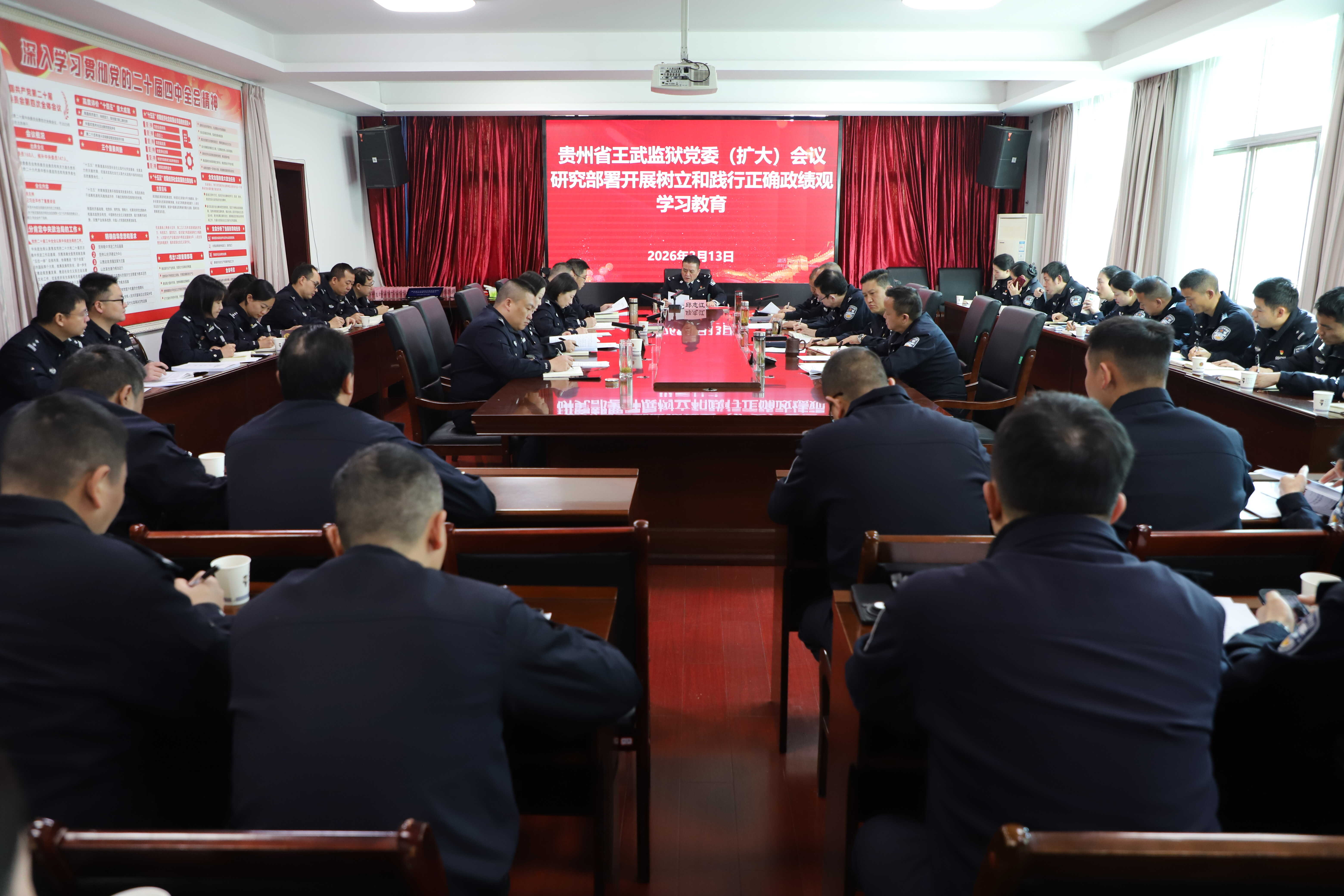 2026年3月13日,贵州省王武监狱召开党委(扩大)会议,传达学习贯彻习近平总书记关于树立和践行正确政绩观的重要论述,全面落实中央党的建设领导小组、省委常委会暨省委党的建设领导小组会议以及厅局党委关于开展树立和践行正确政绩观学习教育相关会议精神,研究部署监狱树立和践行正确政绩观学习教育工作。监狱党委书记、监狱长邱志江主持会议。