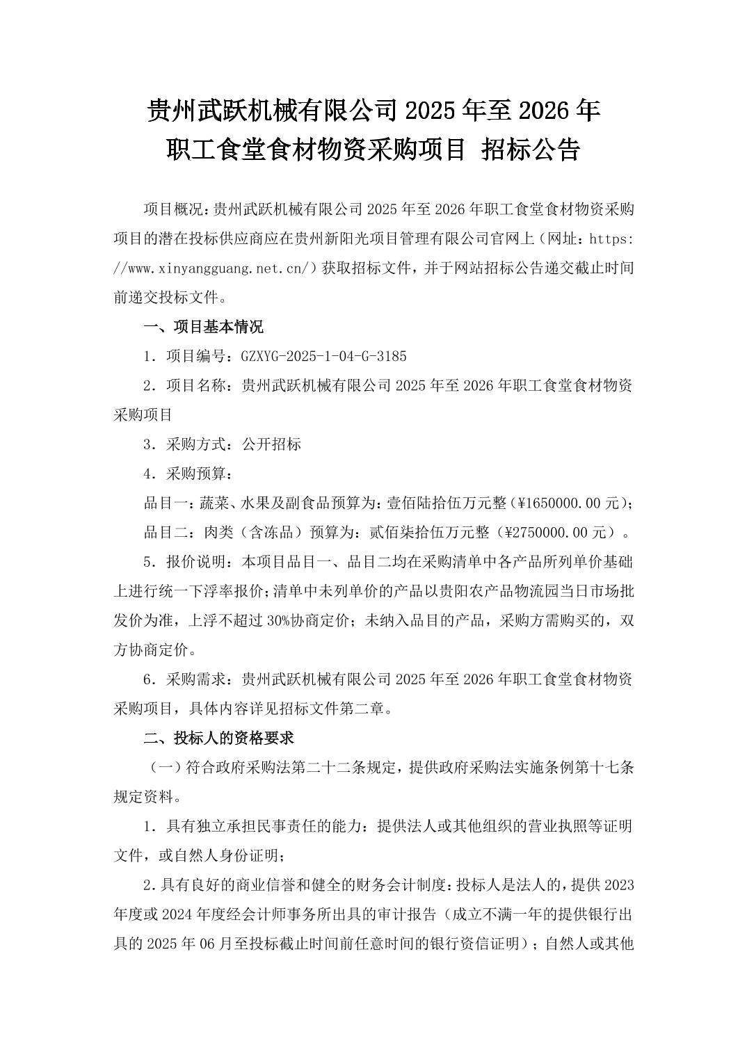 贵州武跃机械有限公司2025年至2026年职工食堂食材物资采购项目招标公告