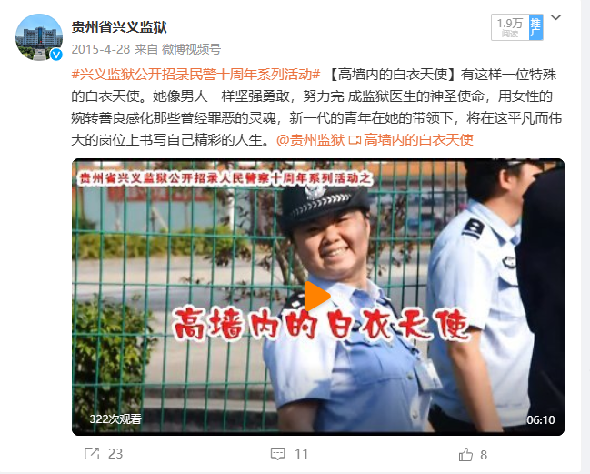 2015年,兴义监狱新闻中心创新举措,首次以视频宣传的方式推出《高墙内的白衣天使》,记录下几十年如一日,用平凡坚守铸就平安的监狱女警故事。