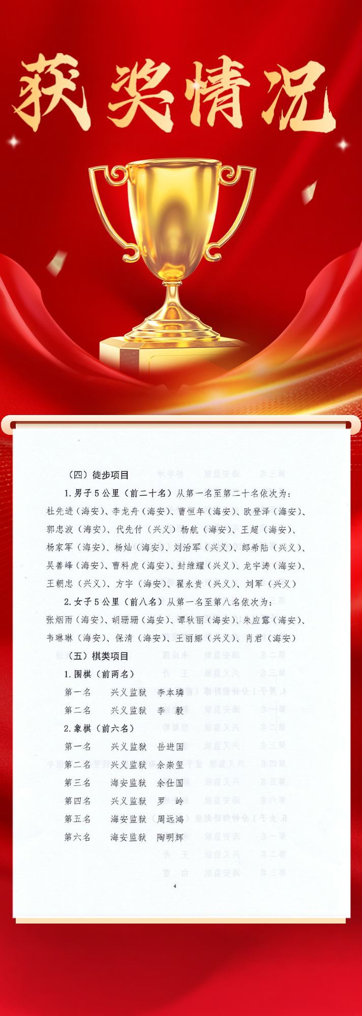 团体项目中,兴义监狱在男子篮球、足球、女子篮球、乒乓球混合团体等比赛中斩获桂冠,海安监狱在4x100米混合接力、4X400米混合接力、羽毛球比赛中拔得头筹,获得冠军。