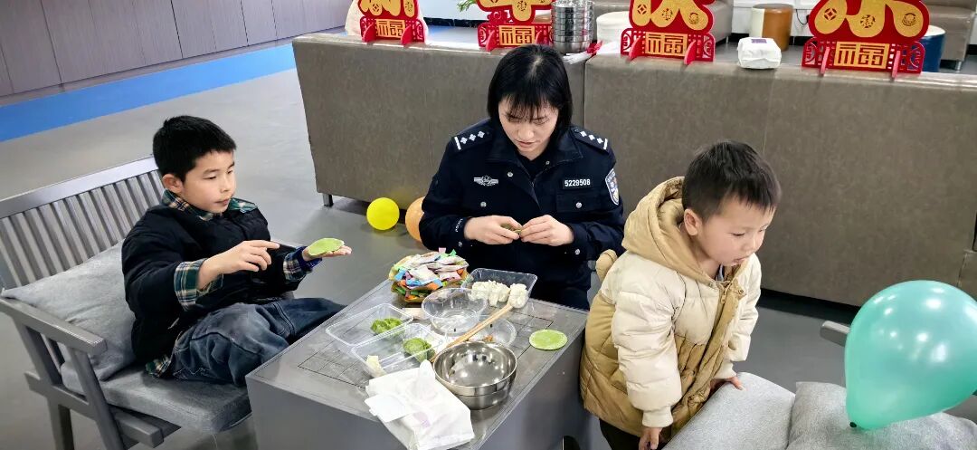 亲子游园活动设置有拍气球穿衣服、亲子福饺、背背欢乐跑等项目。“拍气球穿衣服”考验亲子默契,警宝们手忙脚乱给爸爸妈妈套上队服;“背背欢乐跑”中,警爸们背着萌娃冲刺,气球爆破声与加油声交织,气氛热烈。“亲子福饺”活动中,大家围在一起包饺子,孩子们也围上小围裙参与其中,有模有样地学着大人捏褶子、摆造型。现场充满了孩子们的欢声笑语,温馨热闹,年味十足,民警在警娃的笑声中也暂时卸下压力,和孩子共享其乐融融的亲子时光。
