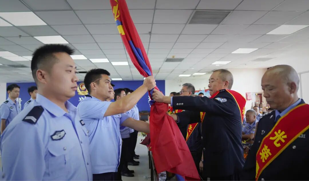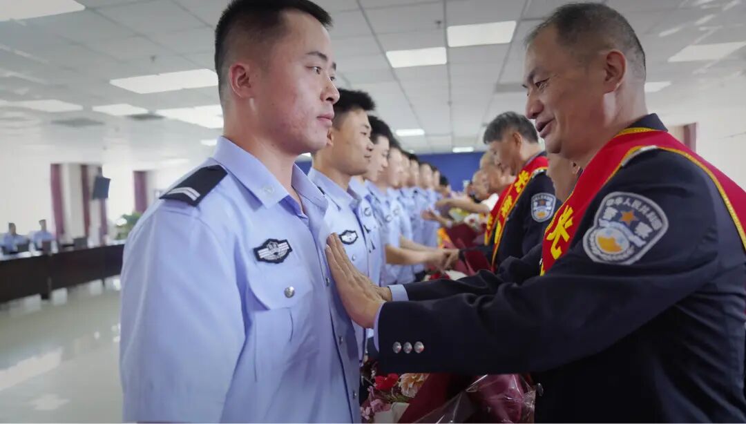 在热烈的掌声中,新招录民警们迈着坚定的步伐,走向敬爱的退休前辈,献上饱含敬意的鲜花。退休民警们为新招录民警佩戴警号,并将警旗庄重地交到新警代表手中,这是使命的交接,更是责任的传递。
