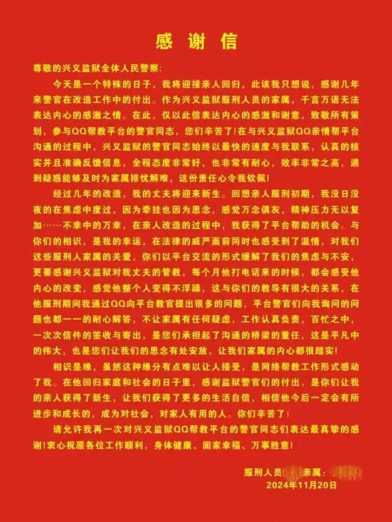 今天是一个特殊的日子,我将迎接亲人回归,感谢几年来警官在改造工作中的付出。作为兴义监狱服刑人员的家属,千言万语无法表达内心的感激之情。在此,谨以此信表达内心的感激和谢意……”