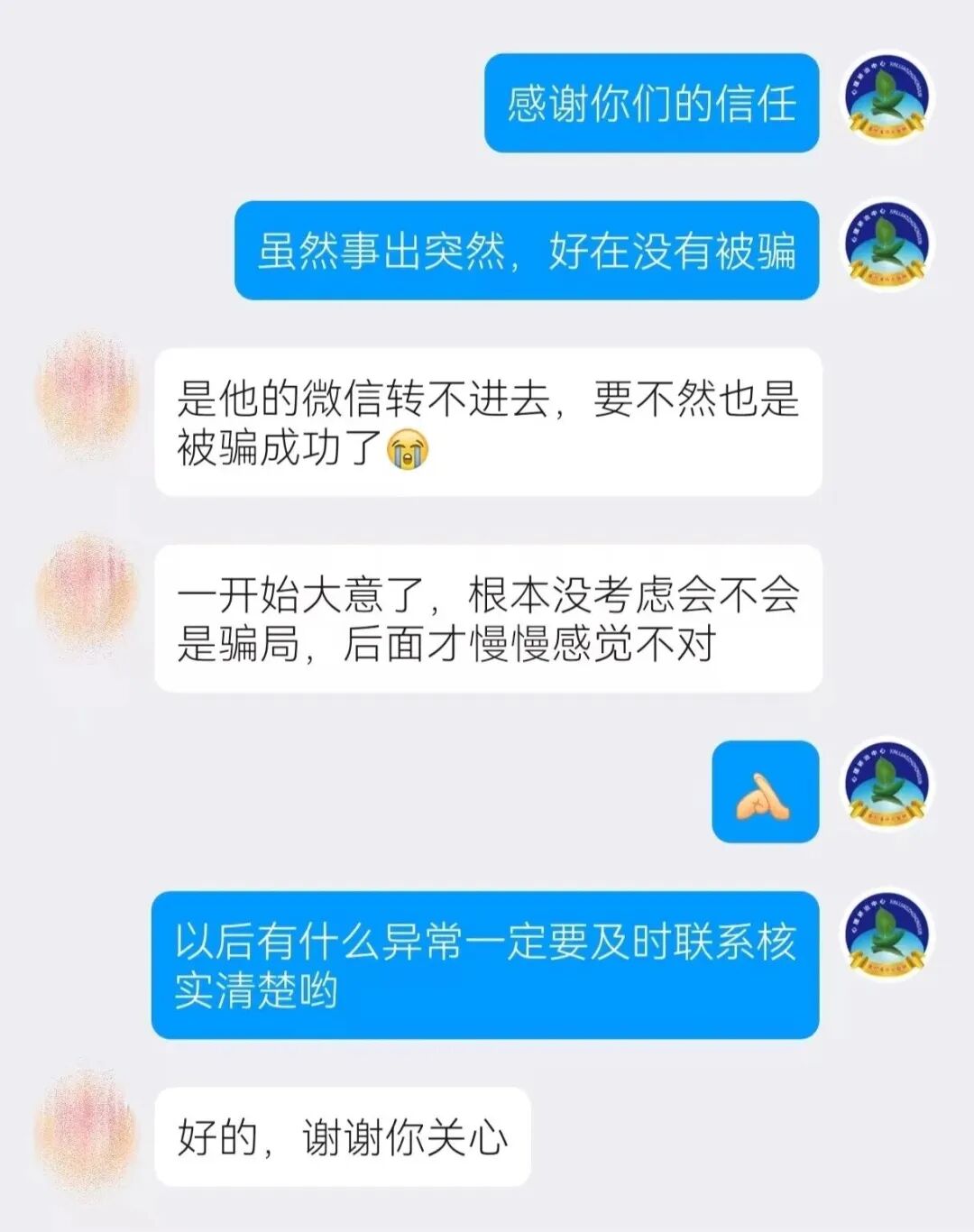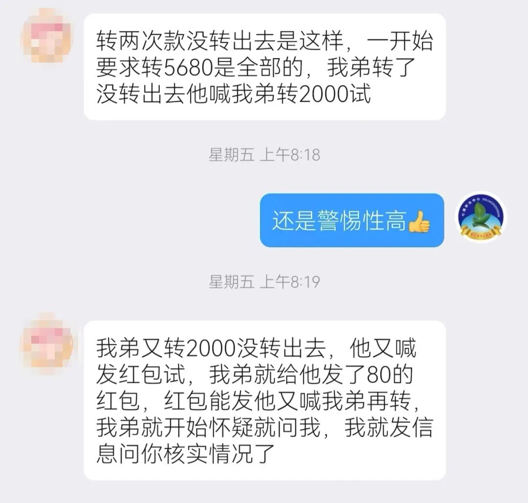 近日,兴义监狱QQ亲情帮教平台突然弹出一名罪犯亲属的多条语音连线申请,民警李全胜敏锐觉察异样,立即引导罪犯亲属用文字沟通。该名罪犯亲属称,刚刚收到“监狱民警”通知:要求马上添加该名“民警”微信,因临近下班,情况紧急,赶紧转账5680元缴纳罚金到微信上,否则将影响他父亲的减刑。这名“收款民警”,还上传了一张身着警服的照片,然后以不方便为由迅速撤回。罪犯亲属考虑到父亲减刑是一件大事,以及在“下班前必须缴费”的紧迫感影响下,便添加了对方微信并转账5680元。转账过去后,显示收款账号被限制交易,对方又提示再转2000元试试,情况依然如此。两次支付失败后,“收款民警”竟要求改发红包,该名亲属转了80元红包过去,对方秒接收。- 民警与家属聊天截图