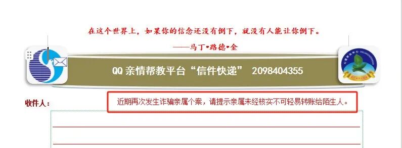 此外,心理矫治中心民警当天紧急在亲情信件上增加防诈提示语,帮助罪犯及亲属提高防诈骗意识,截至目前已下发上百封信件。这场“精准诈骗”,在家属与民警的协力下,成功拦截,避免经济损失,守住了群众的“钱袋子”。 各位服刑人员亲属: