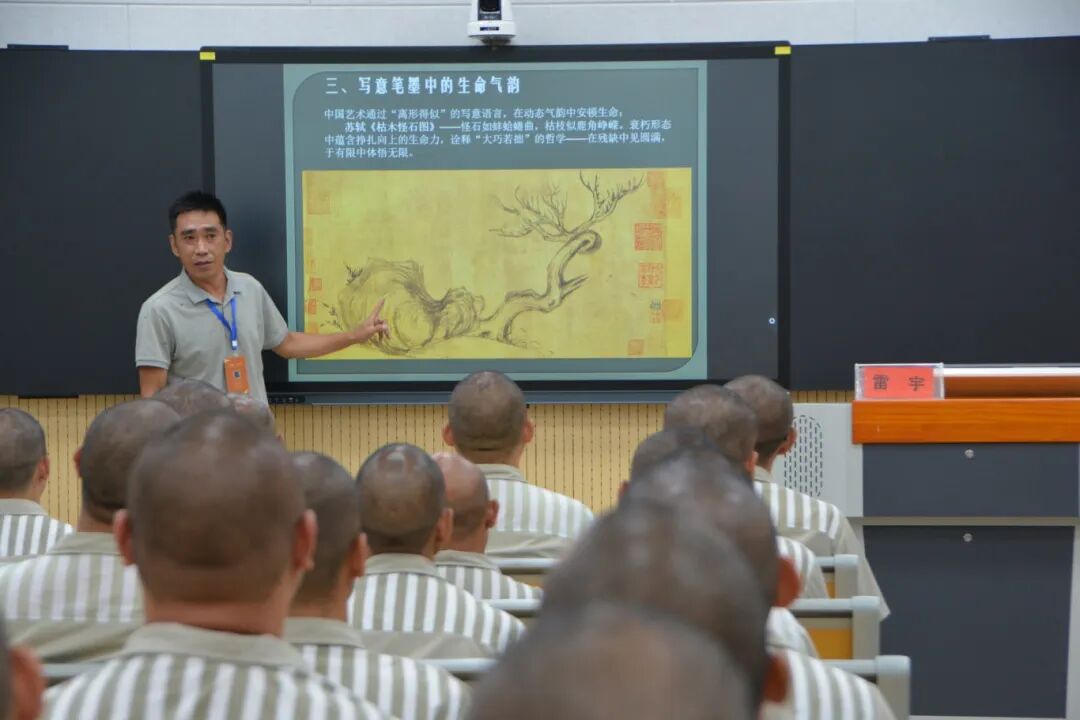 讲座中,雷宇老师以书法艺术、传统建筑、绘画为载体,以思想道德为根基,以行为美学为视角,深入浅出、饱含深情地带领罪犯徜徉于书法艺术中,并现场传授如何从书法中领悟规矩意识与和谐之道、如何通过书法练习调适心态,涵养平和之气、如何在日常行为中体现美与德的统一、如何通过提升审美情趣,明辨是非善恶的方式技巧。