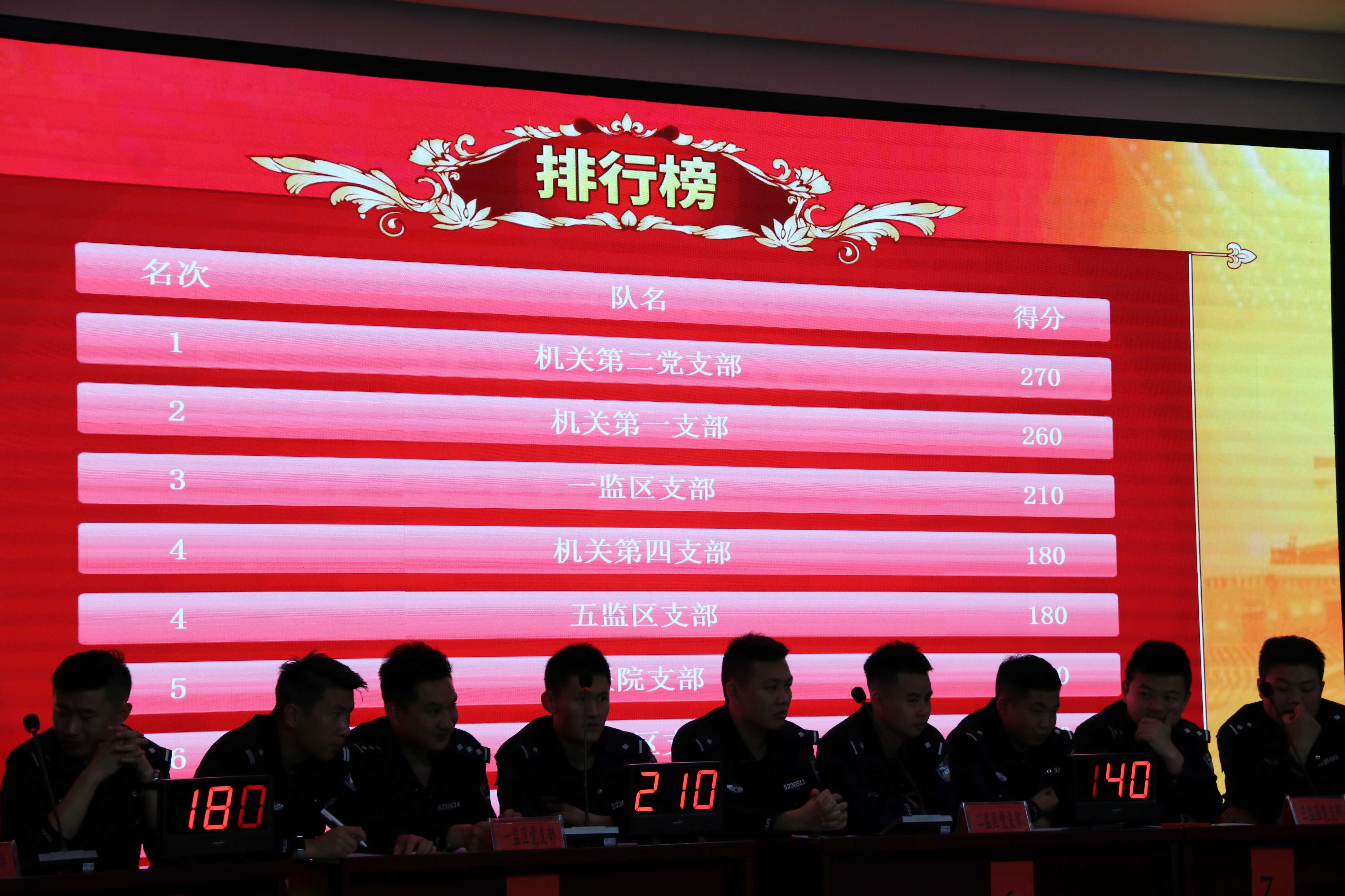 最终,机关第二党支部参赛选手以优异的表现获得一等奖;一监区党支部、机关第一党支部获得二等奖;医院党支部、五监区党支部、机关第四党支部获得三等奖。