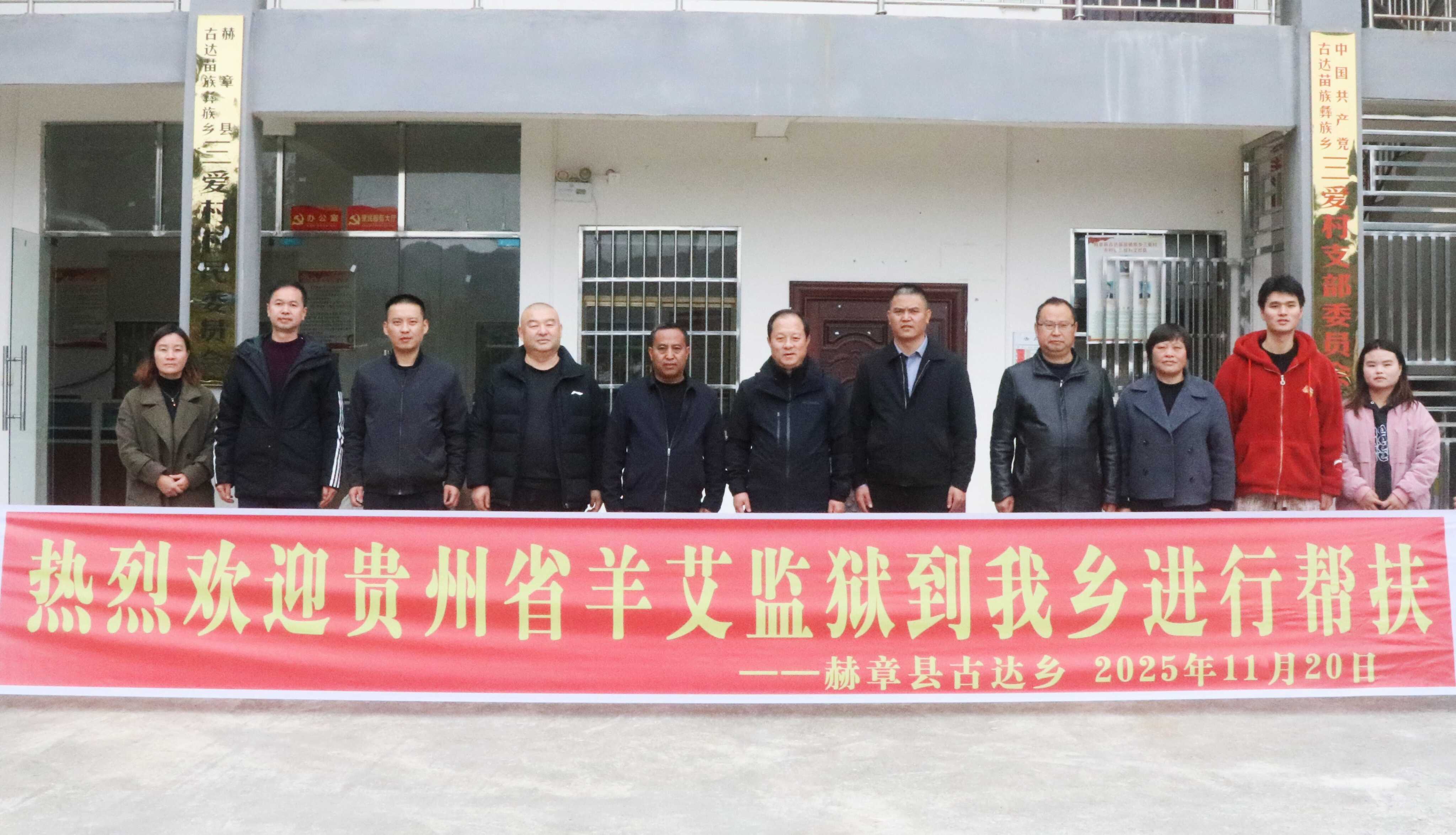 11月20日,贵州省羊艾监狱党委书记、监狱长沈松,党委委员、政治处主任蔡毅带队前往结对帮扶点赫章县古达乡三爱村开展“双联双促”活动。