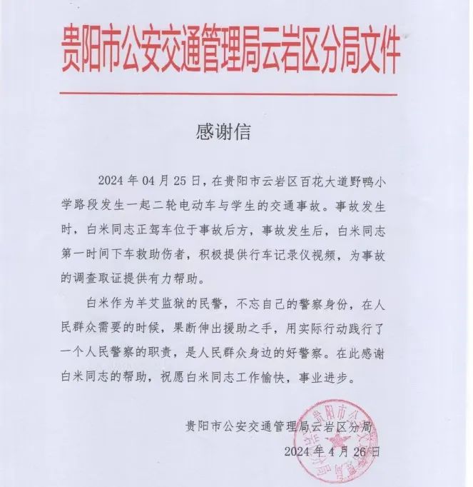 近日,有一名群众带着“危急时刻舍己救人 救命情深恩德难忘”的锦旗来到羊艾监狱门口,想要亲自交到羊艾监狱医院白米警官手中。与此同时,白米还收到了一封来自贵阳市公安交通管理局云岩分局的感谢信。关于锦旗和感谢信背后的故事,要从2024年4月25日下午讲起……