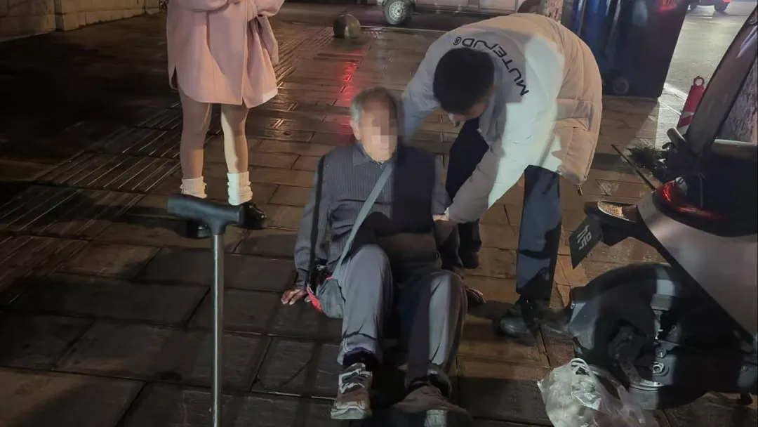 扶起老人后,胡静鑫一边为老人安排座位休息,一边细致观察其神志状态,同时及时报警求助。在等待救援期间,他始终半蹲于老人身旁,轻声安抚,持续关注其身体变化。