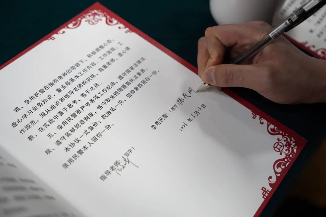 师徒双方郑重签订《“传帮带”结对协议书》。本着“一年跟着干,二年单独干,三年成骨干”的培养目标,协议明确了导师需要传授监管实务、应急处突等技能,徒弟则需完成学习目标并定期汇报成长进度。薄薄纸张承载着“倾囊相授”与“孜孜以求”的双向承诺,为青年民警扣好从警“第一粒扣子”奠定制度保障。