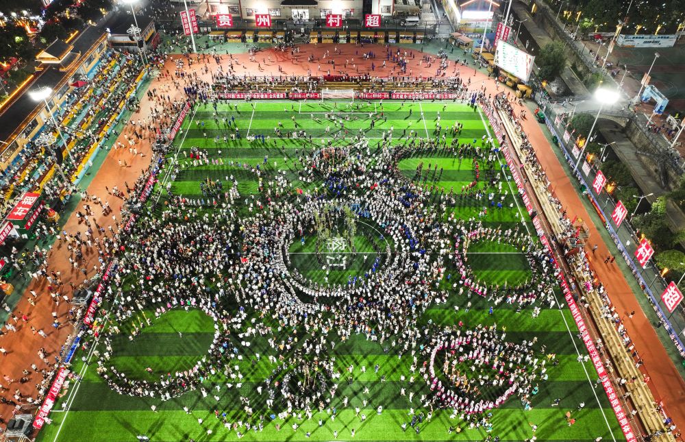 8月23日,人们在贵州“村超”球场跳苗族芦笙舞(无人机照片)。2025年首届“村超”全国赛总决赛在贵州榕江县“村超”球场举行。广东肇庆金利诚峻足球队2:0战胜广东和平商会足球队,斩获全国总冠军。赛事期间同时举办丰富多彩的民族歌舞展演、无人机表演、大型烟花秀,吸引数万观众现场观赛。新华社记者 杨文斌 摄