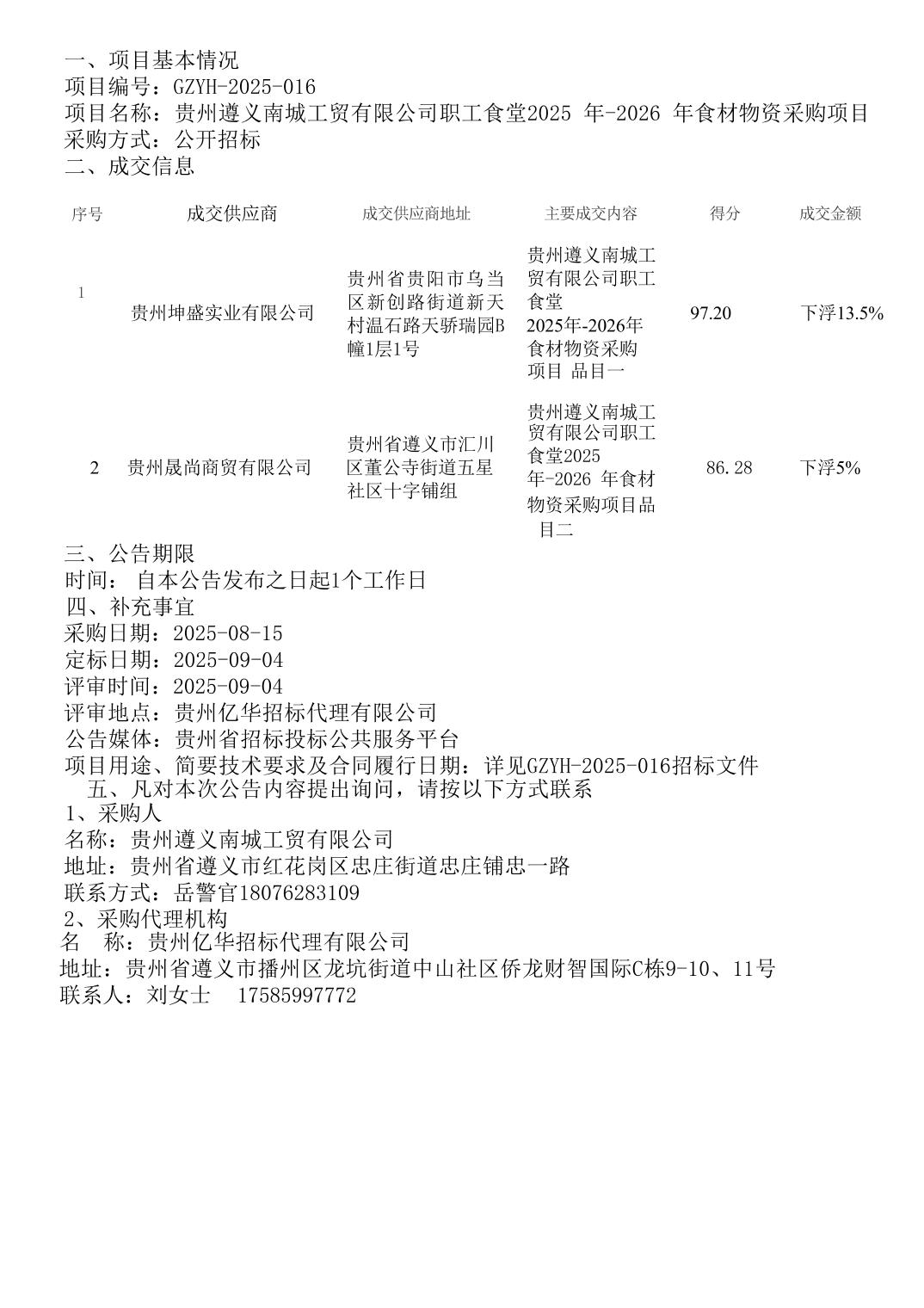 贵州遵义南城工贸有限公司职工食堂2025年-2026年食材物资采购项目 中标 (成交)公告